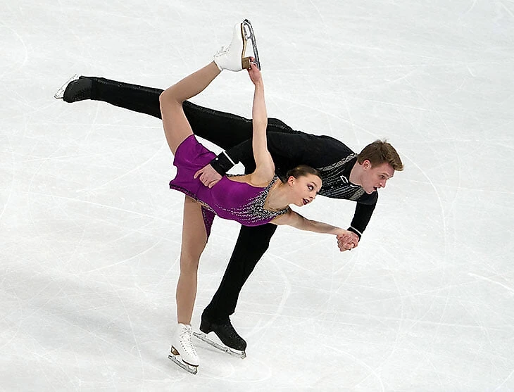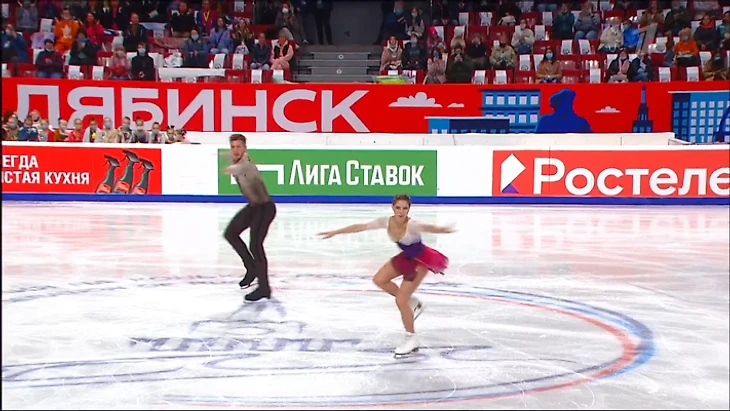 12 сентября, 15:53 В произвольной у чемпионов мира-2021 Анастасии Мишиной и Александра Галлямова плавная и спокойная «Метель» Георгия Свиридова переходит в напористое «Время вперед».