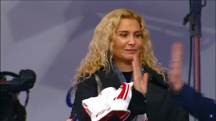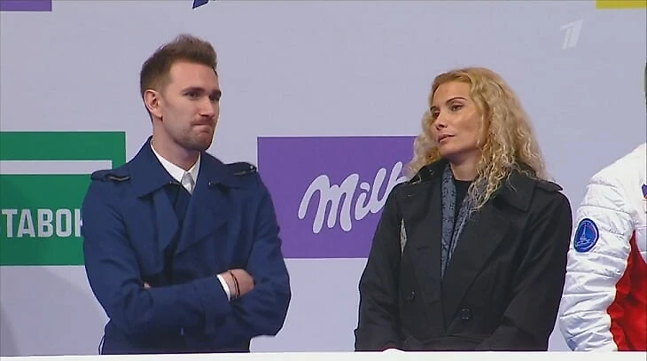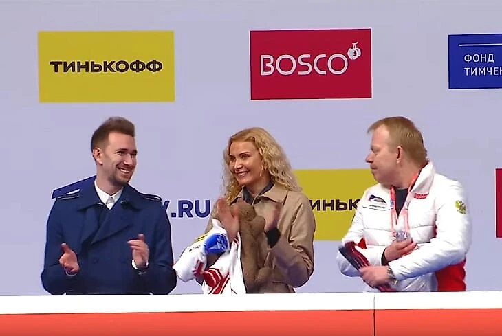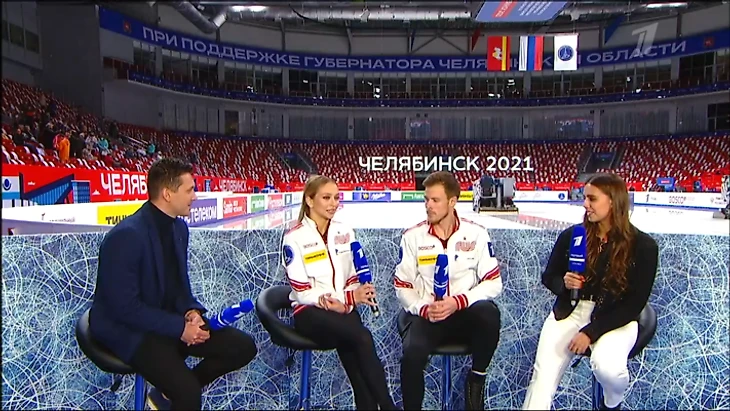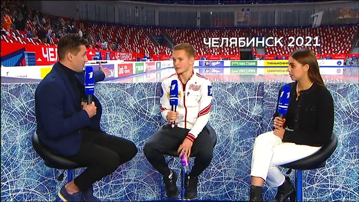 11 сентября, 13:00 Мини-аттракцион на время заливки льда: вместе с Максимом Траньковым интервью у Синициной и Кацалапова берет олимпийская чемпионка по художественной гимнастике Маргарита Мамун.