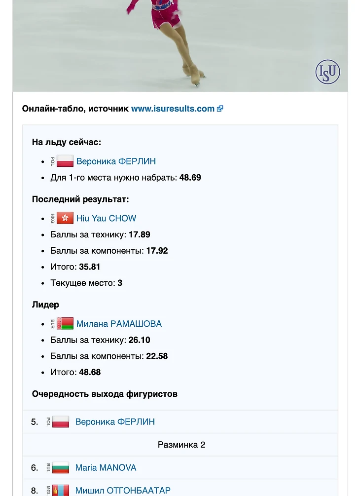 Сделал удобное онлайн-табло прямо под плеером с трансляцией. Видна основная информация, кто сейчас на льду, кто лидер и очередность выхода фигуристов.