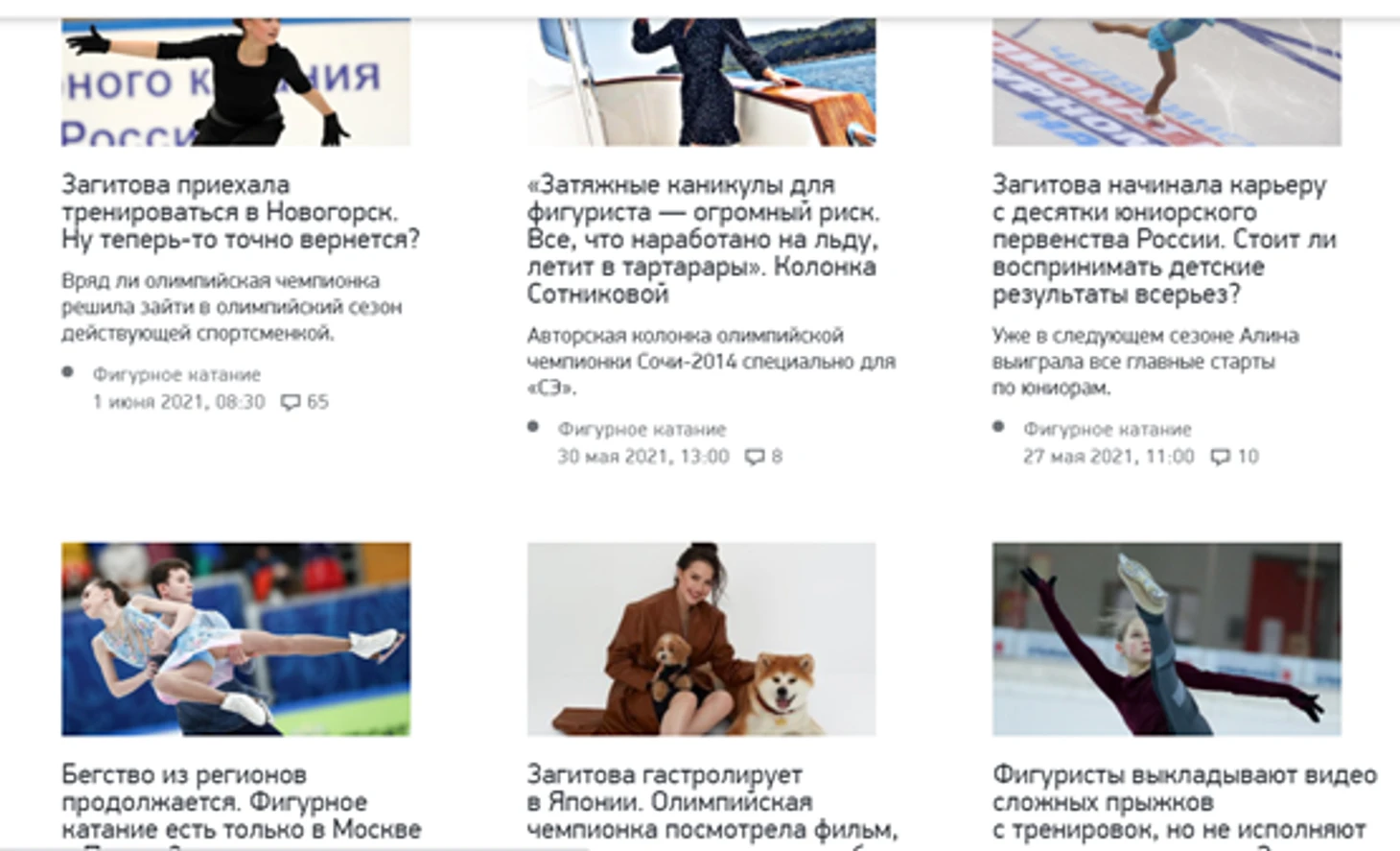 Спорт-экспресс: в отсутствии больших стартов (публикации датируются концом мая и начало июня) крупнейшее СМИ обсуждает не действующих спортсменок, три из которых, между прочим, взяли пьедестал чемпионата Мира, а Загитову: гастроли в Японии, рассказы об ее юниорской карьере и единоразовом приезде в Новогорск. Сам заголовок "Ну теперь-то точно вернется?" (в левом верхнем углу) говорит о том, что спустя два года профессиональные журналисты вынуждены идти на поводу у фанатов и писать кликбейтные заголовки ради привлечения аудитории (что не действует, видимо, ни с ТЩК, ни с ВУХ, ни вообще с кем-либо другим).