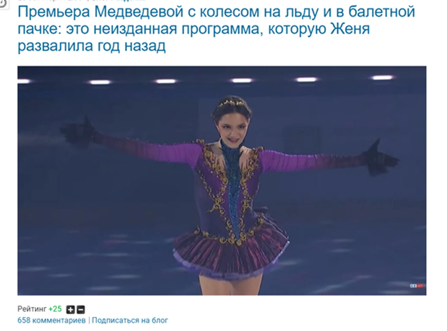 Теперь о Жене Медведевой. Безусловно, ее спортивные успехи и очень дерзкая личность привлекает зрителей даже спустя время. Вот скриншот публикации о произвольной программе "Алегрия": под этой записью пользователи оставили 658 комментариев.