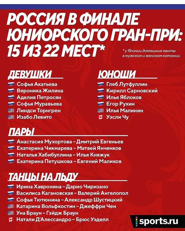 • Главный тренер юниорского катания – Евгений Плющенко. Он повезет в Японию трех спортсменов – Жилину, Муравьеву и Сарновского. У Этери Тутберидзе две участницы финала – Акатьева и Петросян.