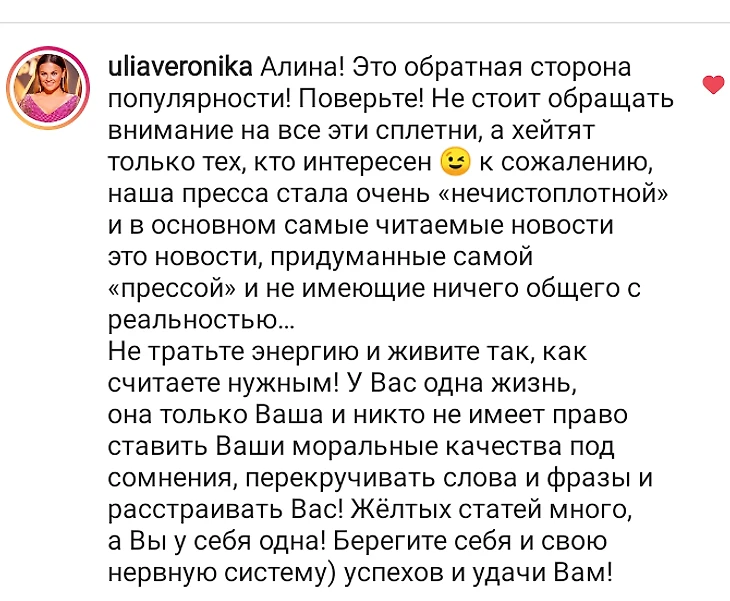 А в сети поддержку оказали Алине только простые люди, её подписчики. И ещё хочу разместить здесь комментарий Юлии Проскуряковой, супруги Игоря Николаева. Очень точные и правильные слова она написала.