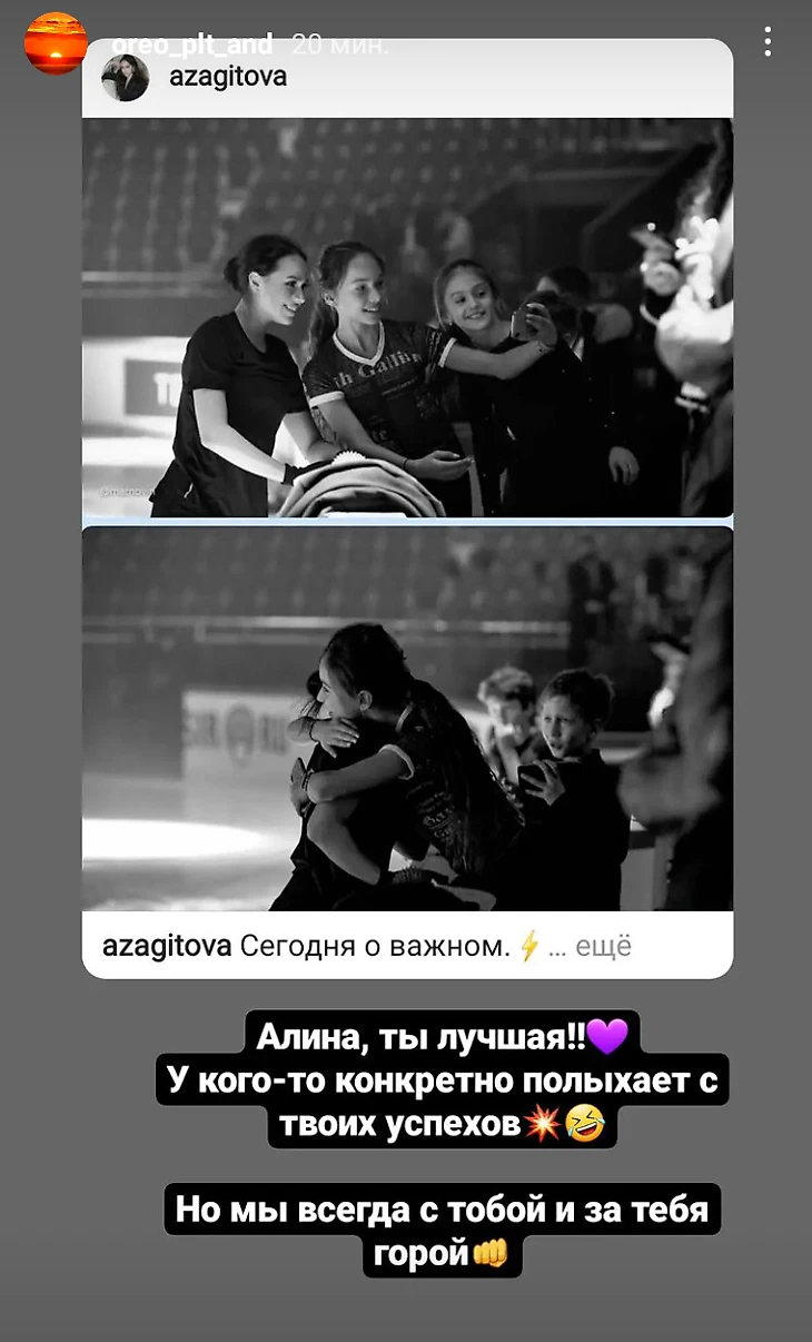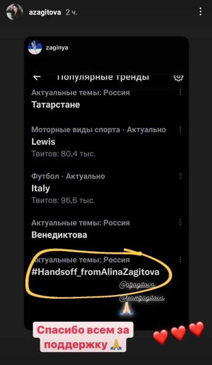 А загифаны твиттера, в своих постах в поддержку Алины Загитовой, вообще вывели в тренды хештэг "Руки прочь от Алины Загитовой!", о чём Алина поблагодарила в своей сторис: