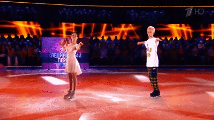 От номера просто дух захватывает! И что больше всего мне нравится в паре Жени и «товарища Дани», так это то, что на мой взгляд, несмотря на то, что Женя одиночница и с парным катанием знакома лишь по шоу, а Даня уж тем более новичок, эмоционального взаимодействия между партнерами ничуть не меньше, чем в парах, где один из фигуристов танцор или парник. В общем, пользуясь случаем и своим положением автора текста, от меня ребята также получают 6.0 и 6.0 😅