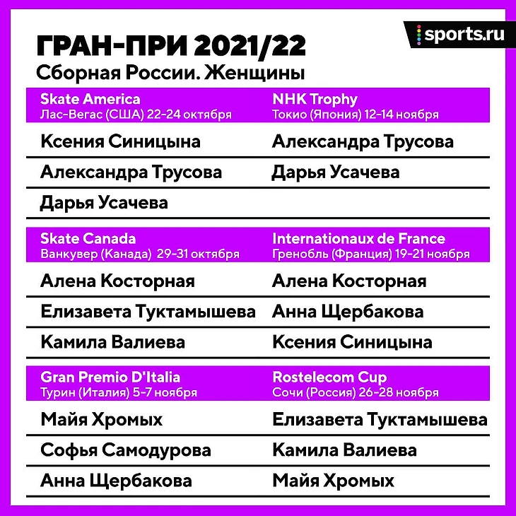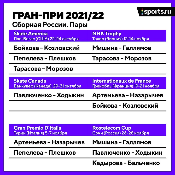 Кстати, не стоит удивляться, что на этапах не пересекаются наши топы: Анна Щербакова, Елизавета Туктамышева и Александра Трусова у женщин, Анастасия Мишина – Александр Галлямов и Александра Бойкова – Дмитрий Козловский в парах.