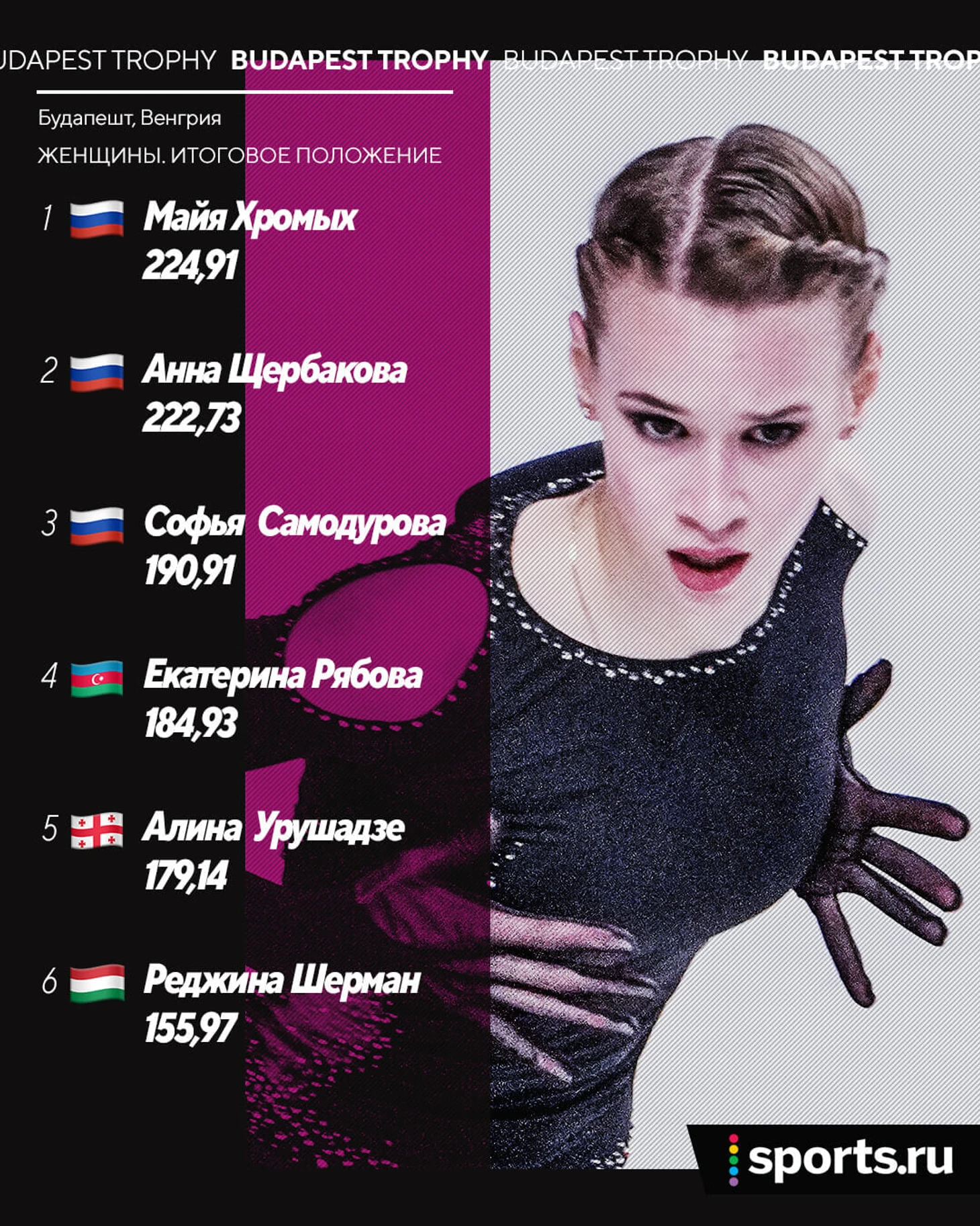 Кому точно не приходится жаловаться на компоненты – это Майе Хромых. В короткой программе трое арбитров поставили Хромых вторую оценку больше, чем Ане, а ее компоненты в произвольной выше, чем у Загитовой, Медведевой, Трусовой и все той же Щербаковой на их дебютных взрослых стартах.