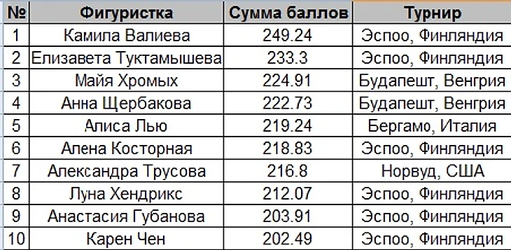 Ниже представлена таблица с результатами первой десятки взрослых одиночниц на сегодняшний день:
