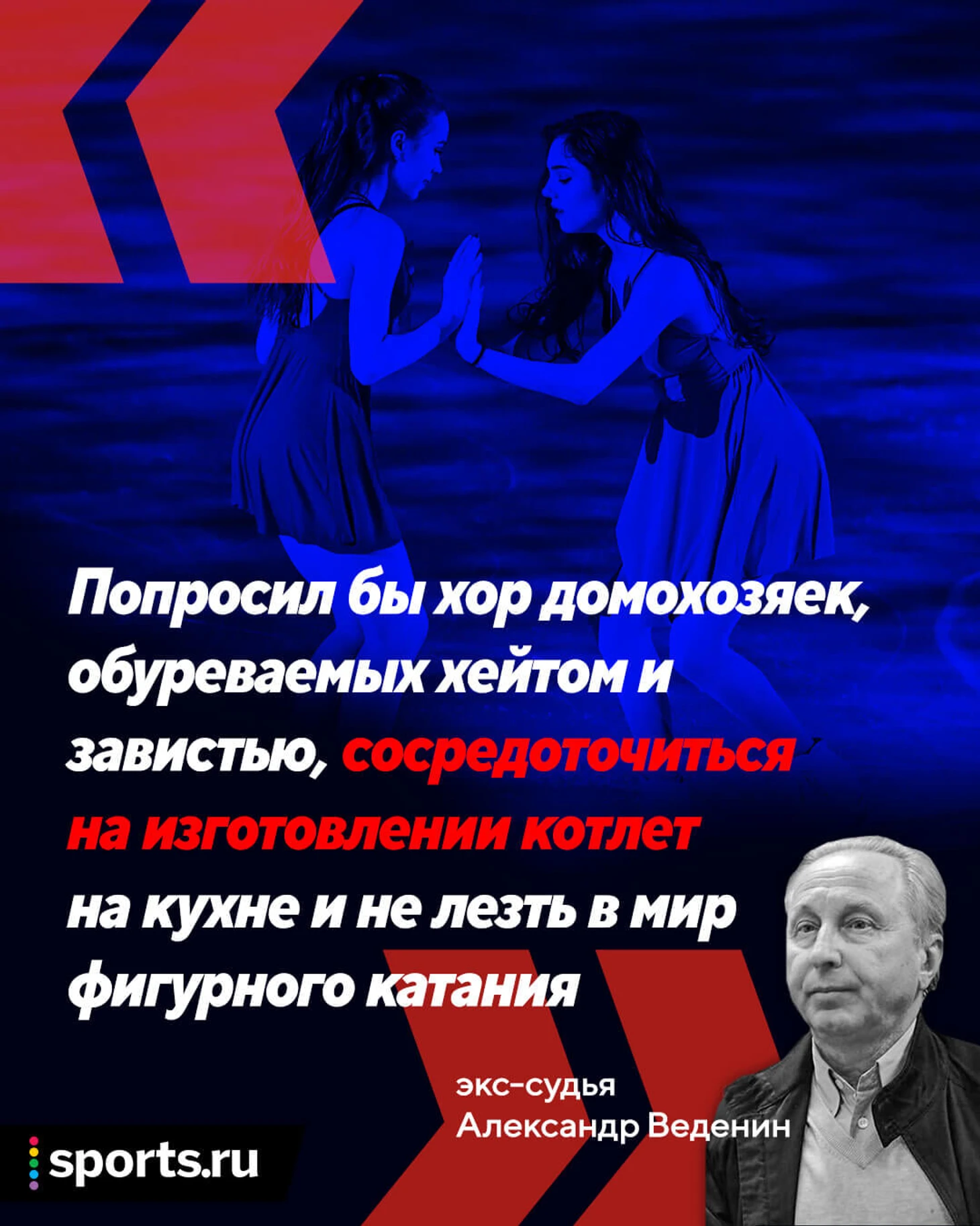 Но я бы попросил наш хор домохозяек, обуреваемых хейтом и завистью, не принимать участия в данной борьбе! Хочется пожелать вам сосредоточиться на изготовлении котлет на кухне и не лезть в мир фигурного катания. Ведь 15-17-летние девочки, которых вы хейтите за «завышенные оценки», читают ваш бред, и он на них не может не влиять».