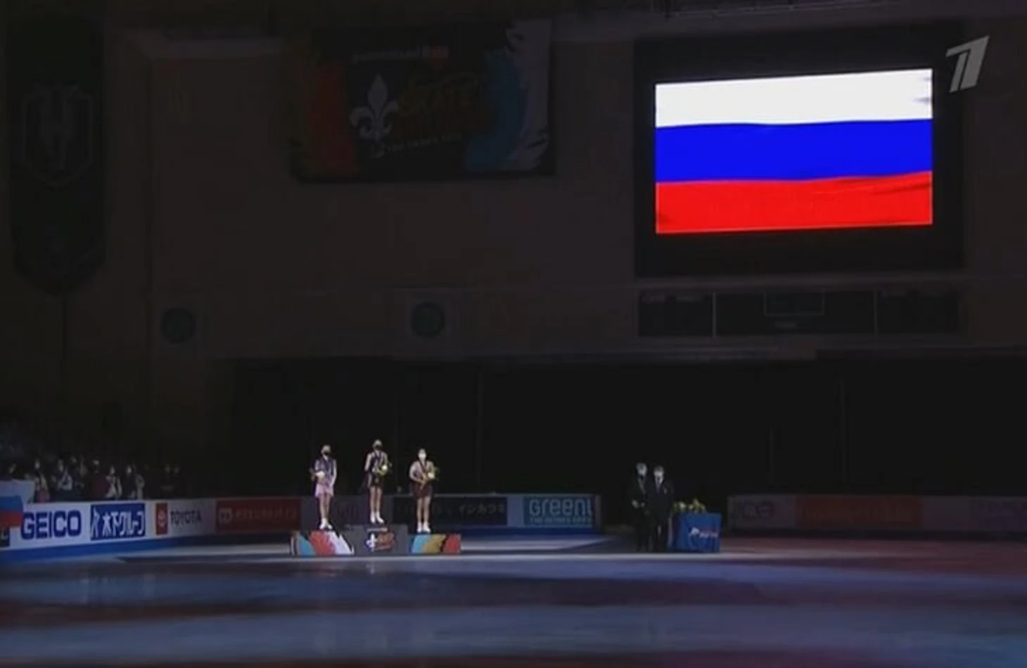 Флаги стран-призеров на этом этапе не поднимали – просто на большом экране во время награждения показывали флаг России.