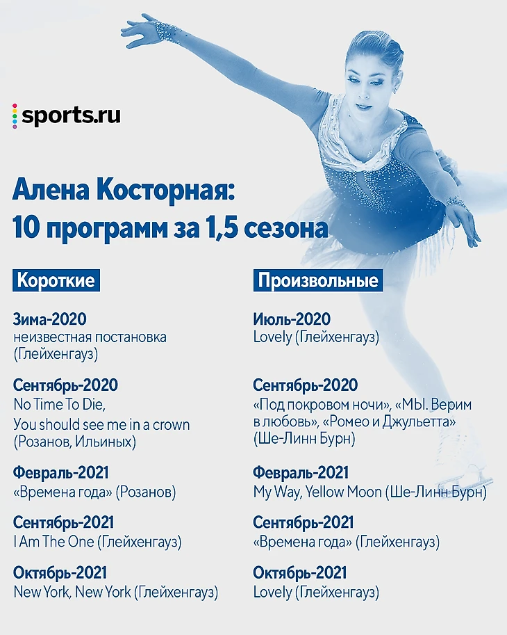 Второй сезон подряд у Алены Косторной чехарда с программами: за полтора года она сменила уже 10 (!) постановок – больше, чем за 6 предыдущих сезонов.