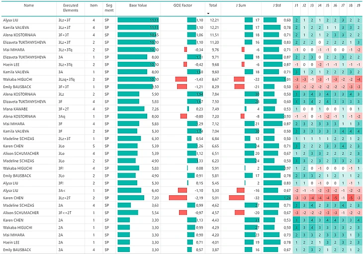 А третья таблица - сравнительная таблица прыжков и каскадов, исполненных девушками. Графа - Base Value - базовая стоимость элемента. Графа GOE Facor - полученные за исполненный элемент плюсы/минусы - полученная надбавка, которая уже выведена в окончательную цифру. Графа J Sum - полученные ВСЕ плюсы/минусы (суммарная цифра). Графа J Std - это разброс, а точнее расхождение мнений у судей. Чем длиннее зеленая полоска - тем больше судьи разошлись в своих поставленных надбавках/убавках.