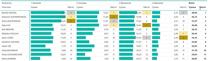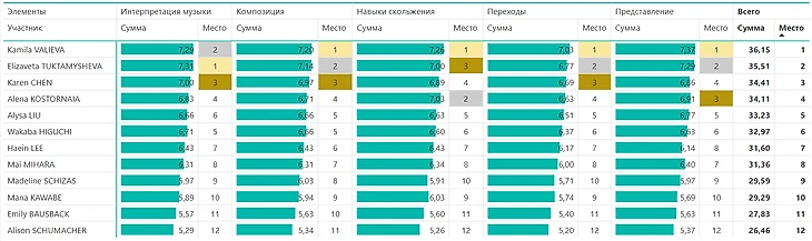 Общая таблица элементов - четыре блока: Прыжки, Каскады, Вращения и Дорожки шагов, где также наглядно видно, кто оказался сильнее и в какой части.