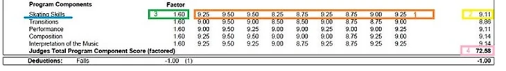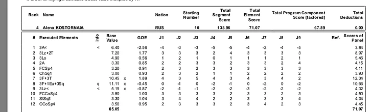 Вращения шли гораздо лучше (за них Алена Косторная получала высокие уровни и плюсы), однако не помогли исправить ситуацию. Судьи значительно хуже оценили фигуристку: стоит сравнить вторую оценку на победном Чемпионате Европы и недавно прошедшем этапе и понять, как значителен и заметен регресс. Вот протокол той победной произвольной: самой низкой средней оценкой является критерий "переходы", оцененный в 8.86