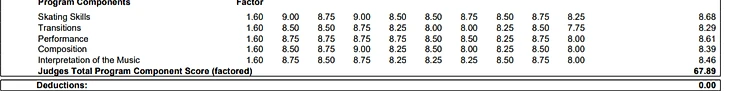 А вот оценки этого сезона: самая высокая из оценок - 8.68 за skating skills ниже, чем самая низкая из прошлого года. Правильно это или нет - вопрос к судьям, но если посмотреть оба проката и сравнить их, то впечатления будут сильно разниться даже у того человека, который эти протоколы никогда не открывал: качество катания сильно запустить невозможно, но уверенность и четкость движений потерять легко.