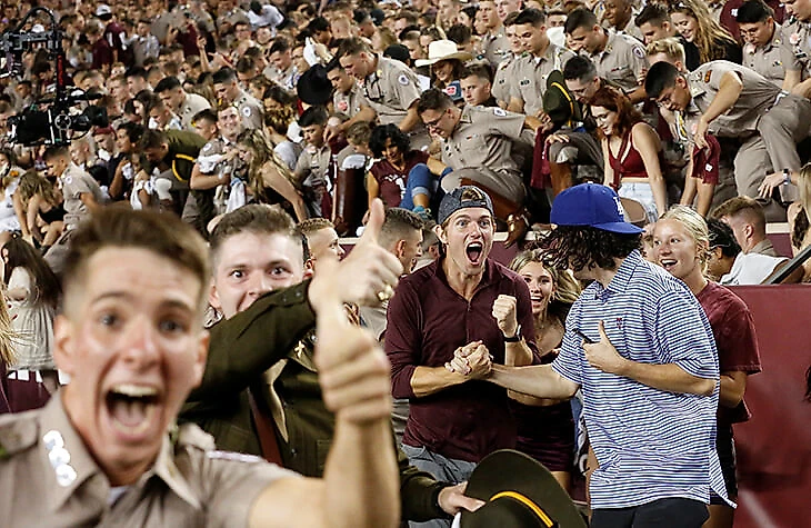 9 октября. В наш кадр вламывается восторженная радость болельщиков. Это студенческий американский футбол, где Техас A&M неожиданно обыграл фаворита Алабаму.