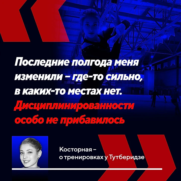 • Косторная тоже отмечала, что, несмотря на более осознанный подход к тренировкам, дисциплина осталась на том же (видимо, невысоком) уровне: «Один раз сказала и очень сильно пожалела, теперь буду молчать. Последние полгода меня изменили – где-то сильно, в каких-то местах нет. Дисциплинированности у меня особо не прибавилось.