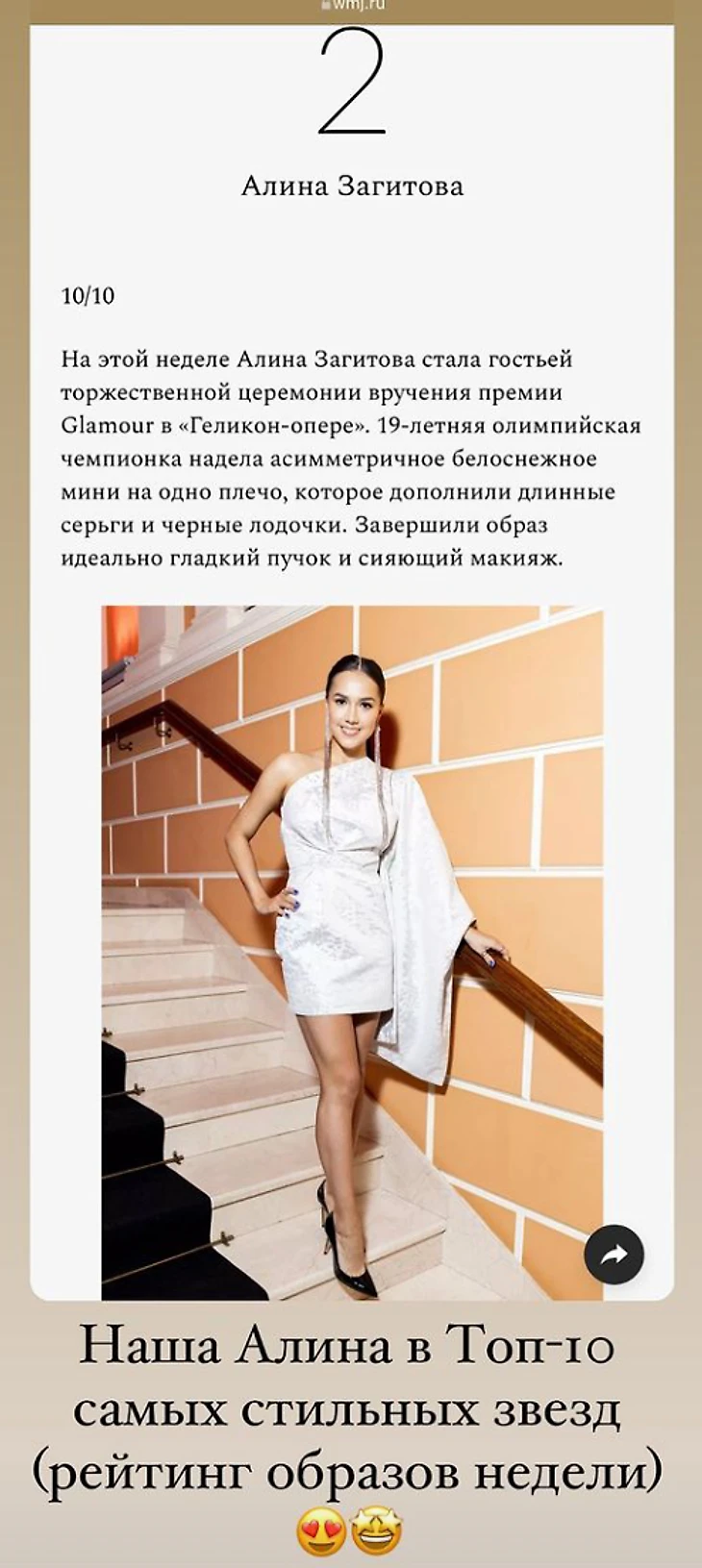 Примечательно, что Алина Загитова вошла в "топ 10" самых стильных звёзд прошедшей недели.