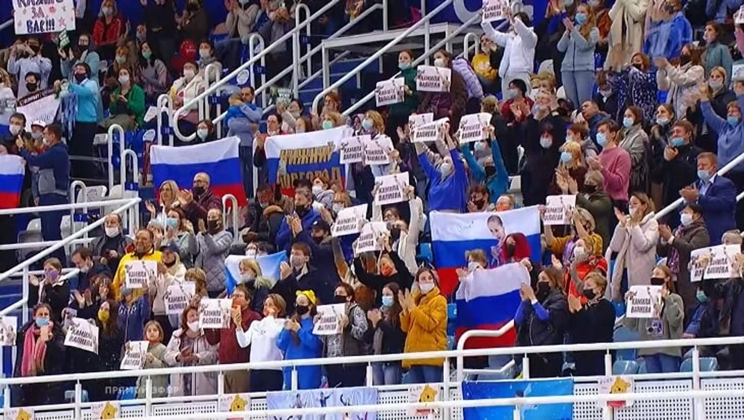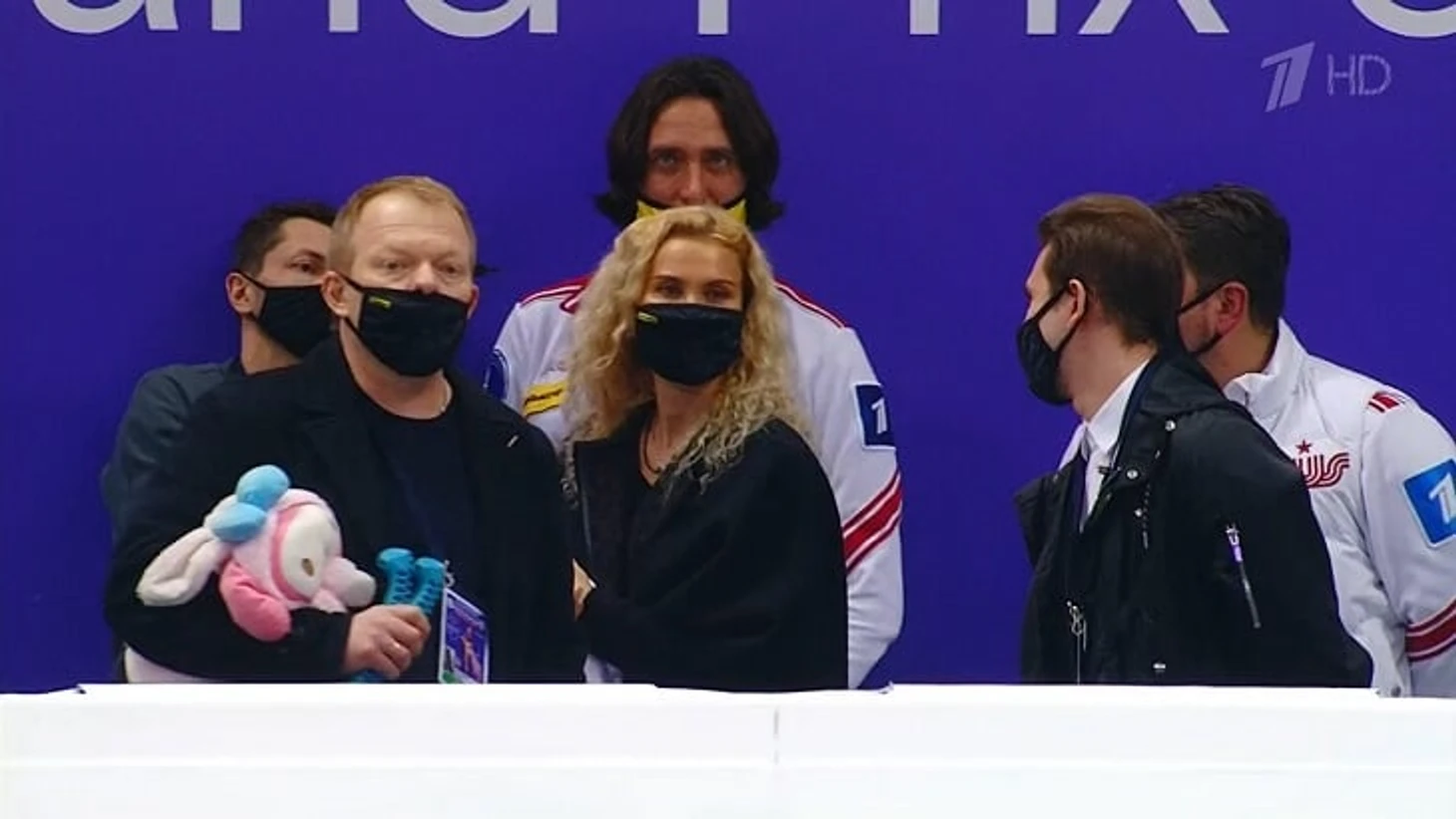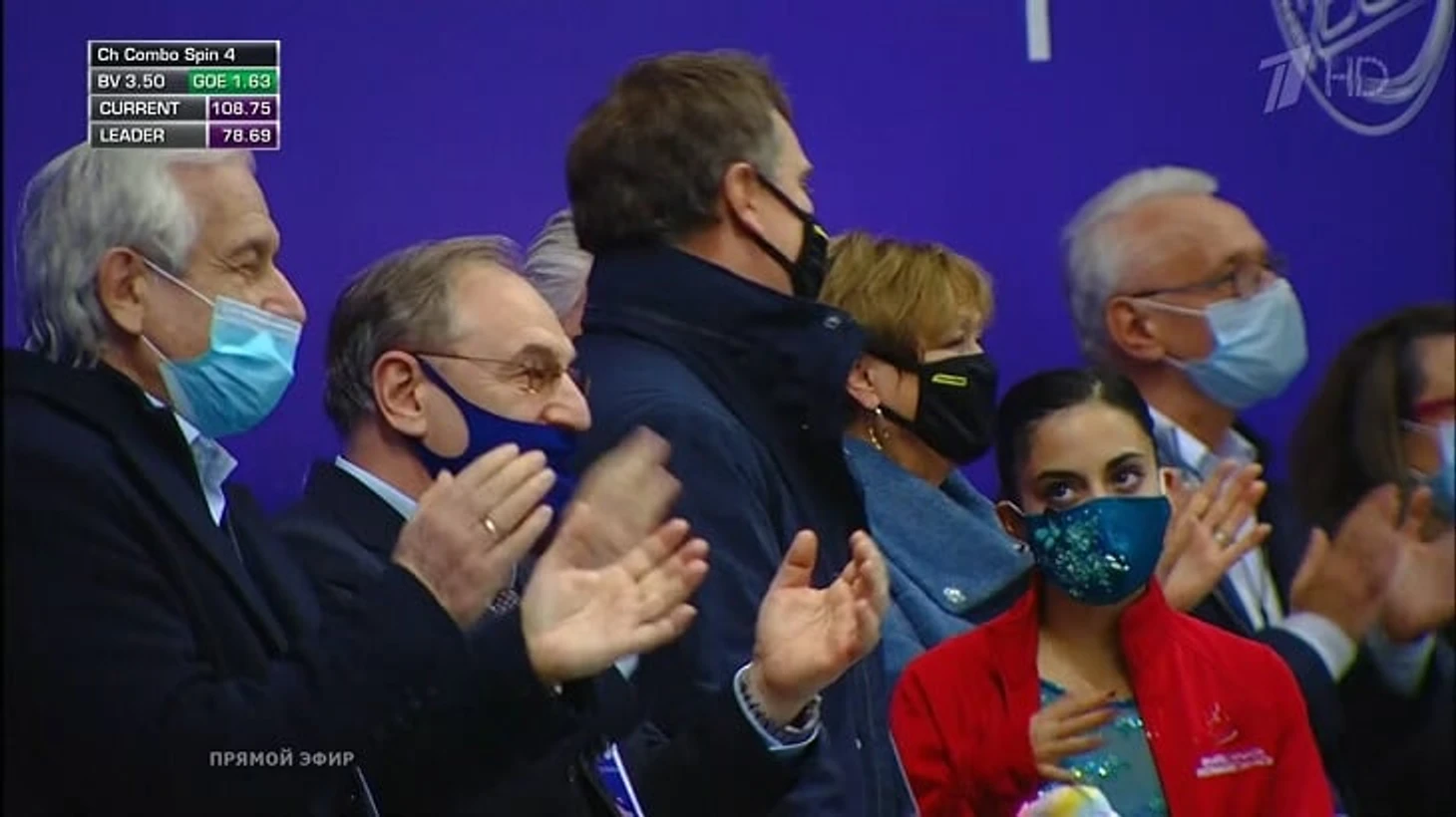 Аплодисменты от спортивных функционеров во главе с генеральным директором Федерации фигурного катания России (ФФКР) Александром Коганом (в синей маске).