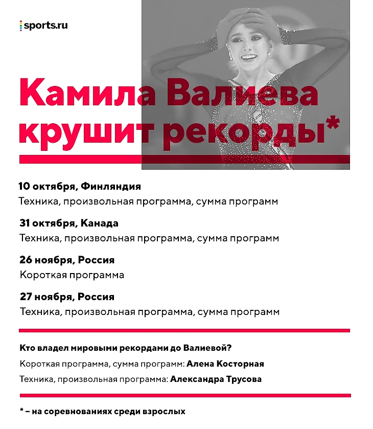 Каждый выход Камилы Валиевой на лед – как веха для фигурного катания: на Гран-при России она выдала два идеальных выступления и побила все мировые рекорды (большинство из них – собственные).