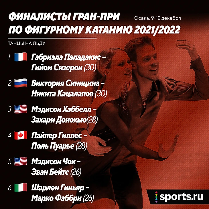 Главная интрига здесь – первая почти за два года встреча действующих чемпионов мира (Виктории Синициной – Никиты Кацалапова) и четырехкратных (Габриэалы Пападакис – Гийома Сизерона).