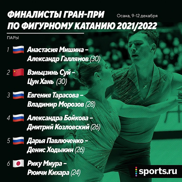 Тут диспозиция почти та же, как и в женском катании – в финале больше всего российских участников (4 пары), из иностранцев пробились только двукратные чемпионы мира Вэньцзинь Суй и Цун Хань да японцы Рику Миура и Рюичи Кихара.