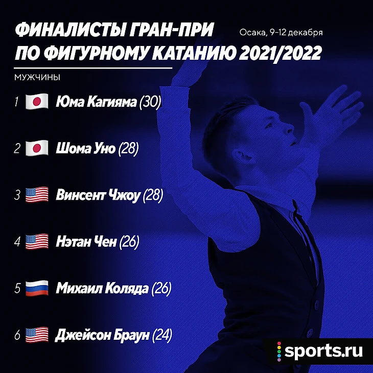 От России в финал попал только Михаил Коляда – он значительно осложнил себе задачу после короткой программы на домашнем Гран-при в прошедшие выходные, но все-таки отобрался в Осаку. Кстати, для Коляды этот финал станет вторым в карьере – до этого он участвовал в турнире только в сезоне-2017/18, когда занял третье место.