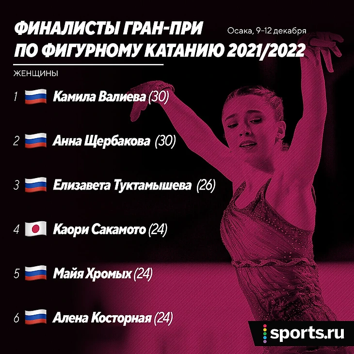 Могло быть и вовсе шесть, если бы Александра Трусова не получила травму и не снялась с этапа в Японии – у нее была победа в США, так что в финал она вышла с любого призового места. Хорошие шансы на финал оставались и у Дарьи Усачевой, но она получила травму на разминке в Японии и тоже осталась без второго этапа.