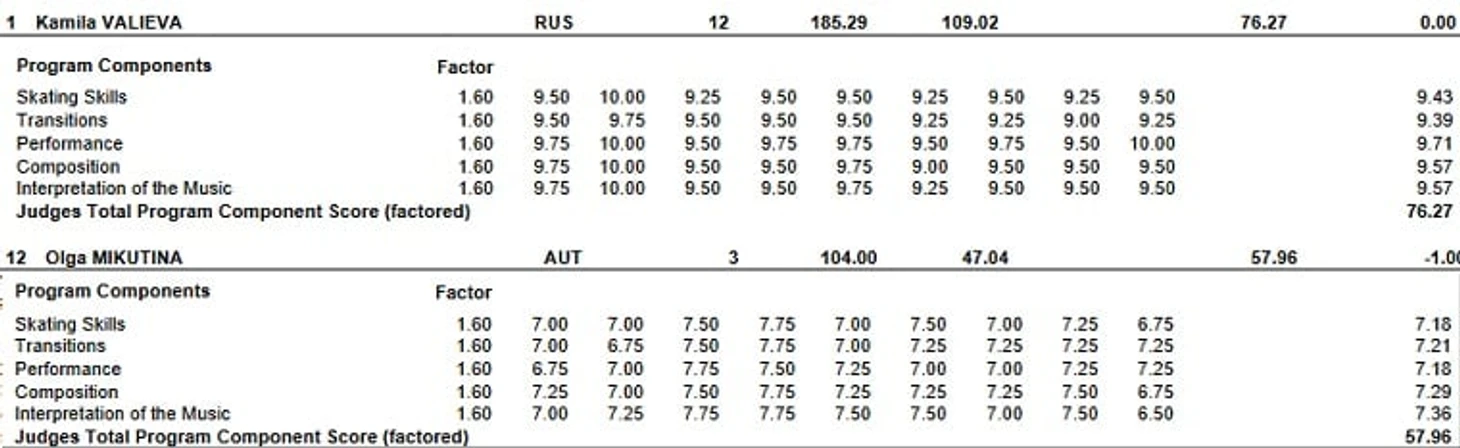 Вообще, само разделение оценки за компоненты на критерии логично, но по факту почти не работает. Давайте опять взглянем на оценки на Гран-при России, только возьмем не одну Валиеву, а еще и занявшую последнее место австрийку Ольгу Микутину: