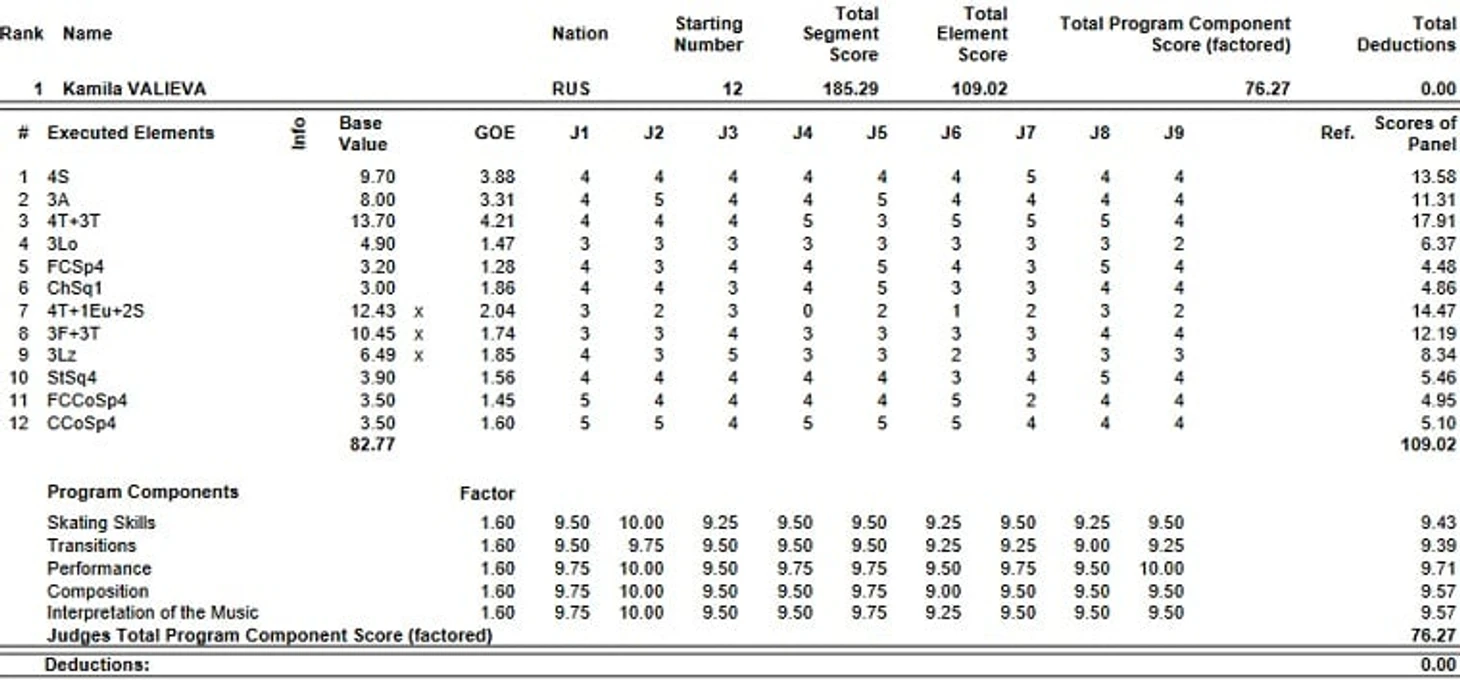В оценке по шкале GOE у судей нередко разное мнение – конкретно в этом случае у Валиевой в некоторых элементах разброс в несколько баллов от разных арбитров. Например, за каскад четверной тулуп – двойной сальхов через ойлер оценки совсем разные: есть +3, +2, +1 и даже 0. Порой разница еще больше (скажем, в 5 баллов) – и это нормально, поскольку один арбитр может заметить что-то, что не увидел другой.
