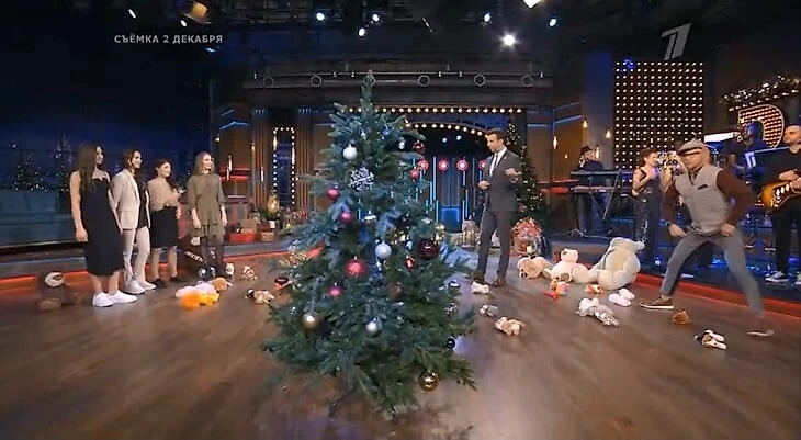 После разговора фигуристки, Ургант и Дмитрий Хрусталев сыграли в игру «Тут бери, туда бросай». Правила простые: Косторная, Валиева, Щербакова и Хромых стояли с одной стороны барьера, ведущие – с другой, а на полу лежали мягкие игрушки.