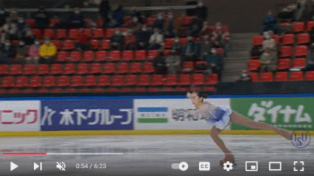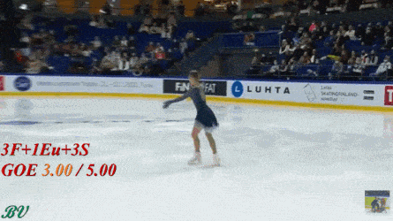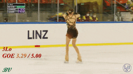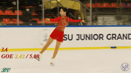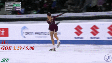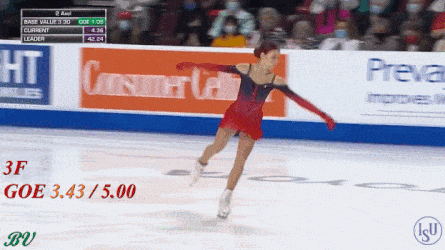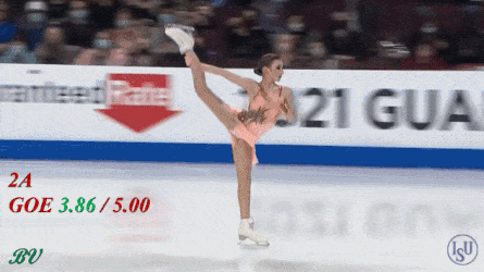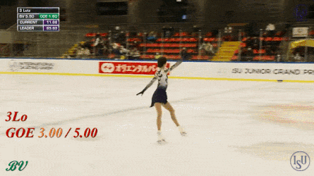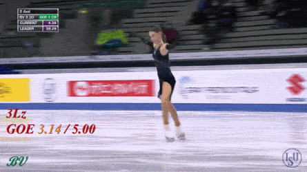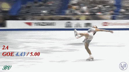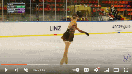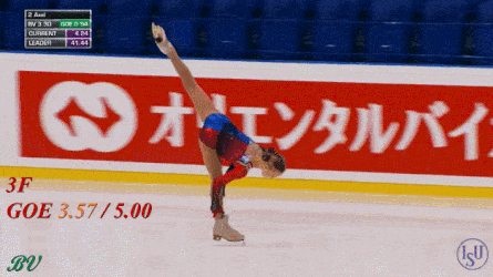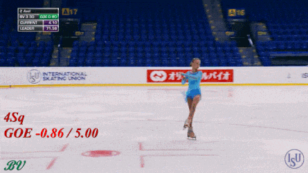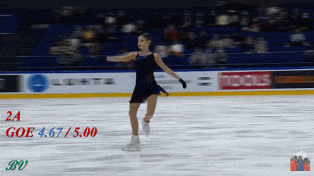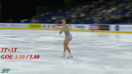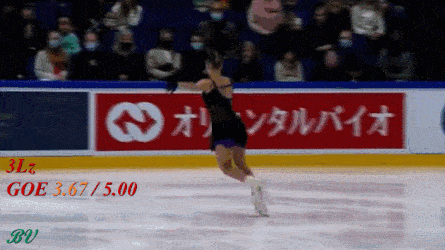 Заход: спираль Туктамышевой (1.2 сек) - моухок. Подготовка 1.7 сек, высота 41 см. Мощный выезд в низкий корбалик со сменой направления. Сакамото свой американский аксель на 4.00 / 5.00 с запасом улучшила на домашнем этапе. У неё очень огромные скорость и пролет на этом прыжке. К сожалению, мы не можем ничего из этого измерить, чтобы преимущества японки зафиксировать цифрами, поэтому наслаждайтесь гифкой. Как правильно называется её спираль я, конечно, не знаю (напишите в коментах, плес), но это и не так важно. Надбавки здесь близки к максимальным, где-то уже половину судей выставили +5. Тем не менее, нашлась фигуристка, которая получила еще больше с первой попытки.