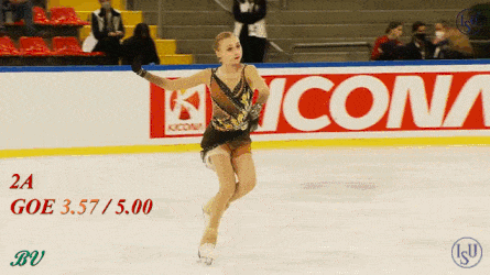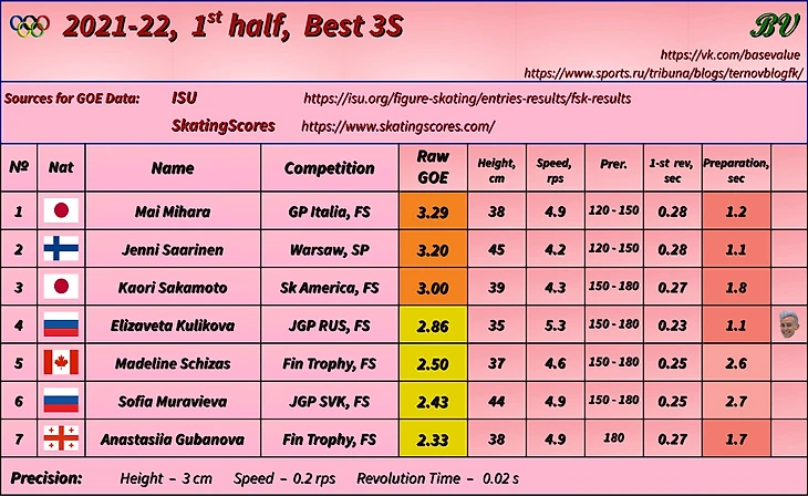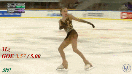 Заход: крюк - ласточка - смена ноги - скобка - моухок. Подготовка 1.6 сек, высота 38 см. Не самый огромный, но достаточно легкий прыжок, с мягким заходом и выездом. И несмотря на начало сезона и юниорский статус соревнования сразу весьма приличные надбавки, в основном между +3 и +4. И это только пятое место! Софья также владеет трикселем, как вы уже знаете, так что здесь мы еще удачно поймали возможность внести её в рейтинг по дупелю. Её триксель из короткой 5-го этапа КР примерно 52 см в высоту. При этом скорость вращения при переходе от 2А к 3А возрастает примерно с 4.8 rps до 5.7 rps. То есть лишний оборот добавляется за счет 14 доп. сантиметров высоты и почти одного об. в сек. крутки.