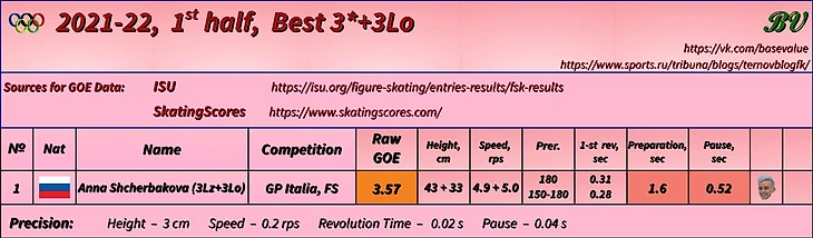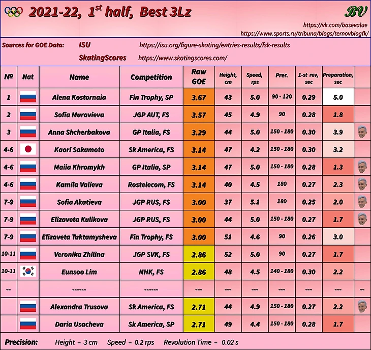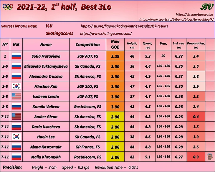 Еще интересно отметить 3Lo кореянки Чо-Ён Парк с US International Classic, где она чуть не достала Трусову. Её ритт получил 3.33 / 5.00 по трем судьям, но мы его не учли, так как в этом году этот старт не идет в бесты ISU. В принципе, кроме высоты на ~43 см он ничем не выделяется.