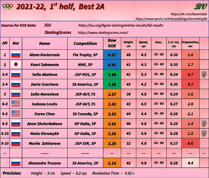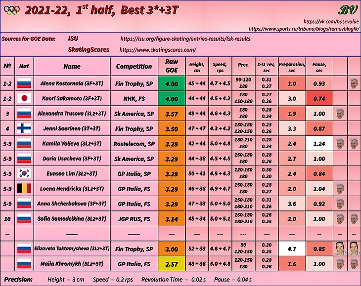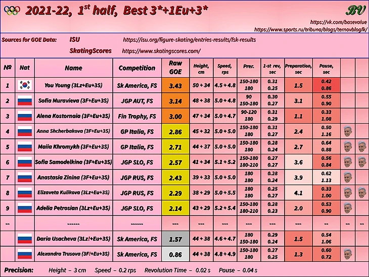 1. Еще раз отметим, что в рейтингах к данному посту большую роль играл фактор случайности, судейские и технические бригады на разных турнирах разные, а разницы в ГОЕ часто не превышают седьмых долей балла - 0.14, 0.28, то есть, буквально, определяются настроениями одного судьи. Конечно, более показательной будет статистика по большему кол-ву стартов, но пока её нет. Сильнее других здесь по известным причинам пострадали Трусова и Усачева с одним этапом ГП. В чуть лучшей ситуации оказались Щербакова и Хромых с двумя этапами, но не учтенным Будапештом. Еще лучше ситуация у Косторной, Туктамышевой и Валиевой, которым выпала достаточно лояльная бригада в Финляндии + по три учтенных старта + в случае последних двух еще и домашний Ростелеком. Определенно не на что жаловаться Софье Муравьевой с этапом ЮГП в Австрии. Ну и участницам российского этапа ЮГП наверное тоже. Может быть, ближе к концу цикла у нас будет более объемный пост с учетом нескольких сезонов. Но пока только так.