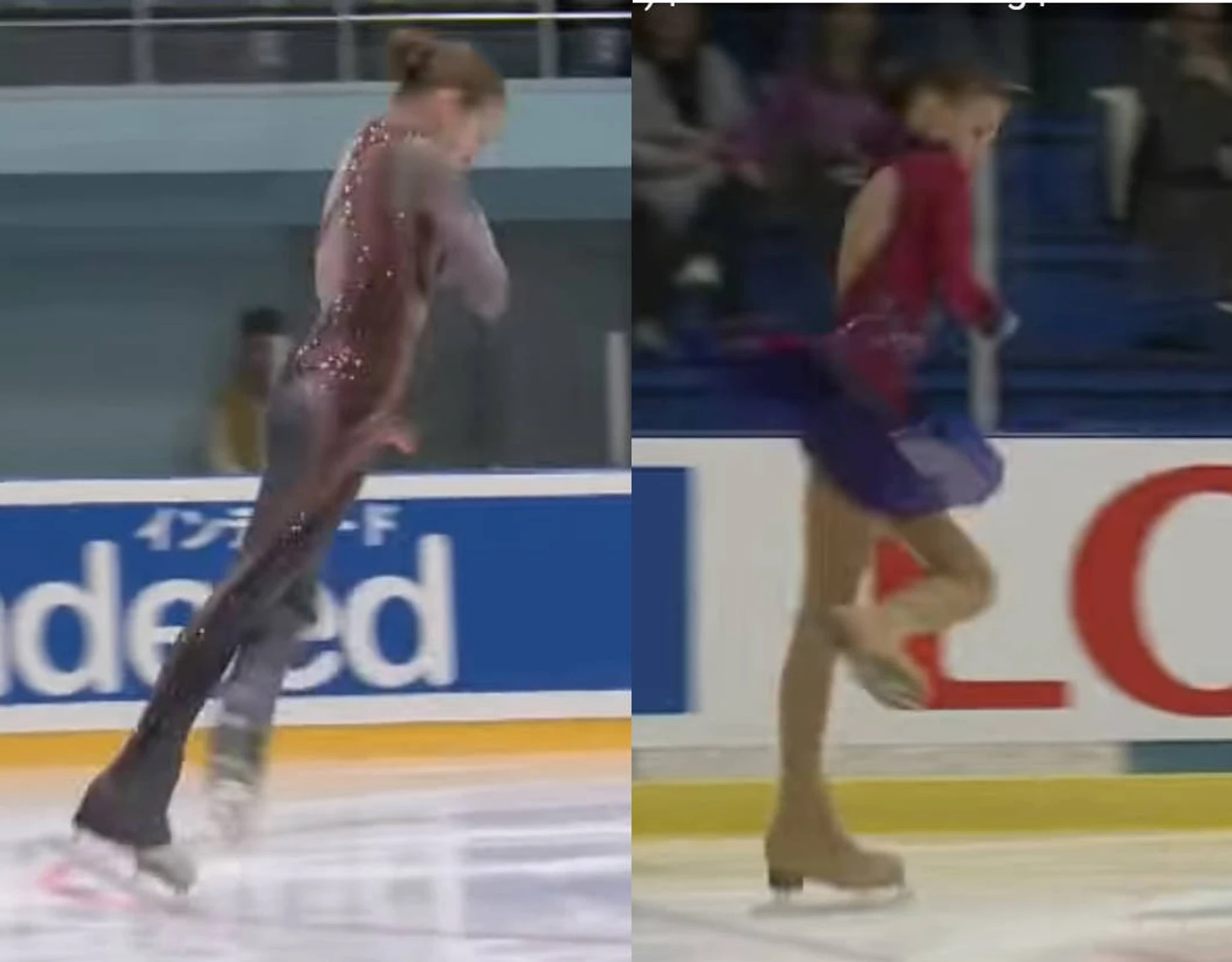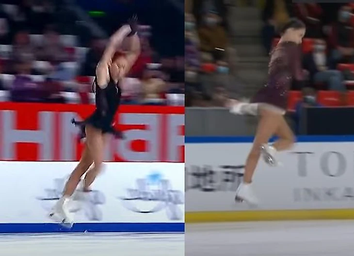 Триксели Ю, Лью и Косторной официально недокручены, поэтому прошли по минусам. При этом, Алена и Алиса единственные, у кого здесь более или менее сложный заход, причем одинаковый: крюк - выкрюк - перетяжка - моухок, у Алисы чуть дольше подготовка после перетяжки. Косторной, как выше уже отмечалось, вероятно не хватило крутки и мешает задержка, Лью в основном не хватает высоты, у Ю примерно что-то среднее - не хватило и того, и другого, но в меньшей степени.