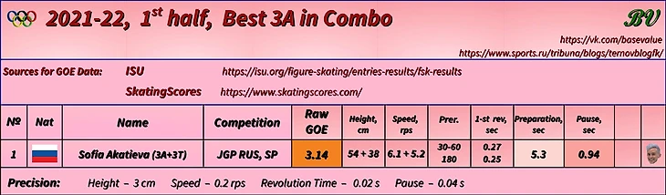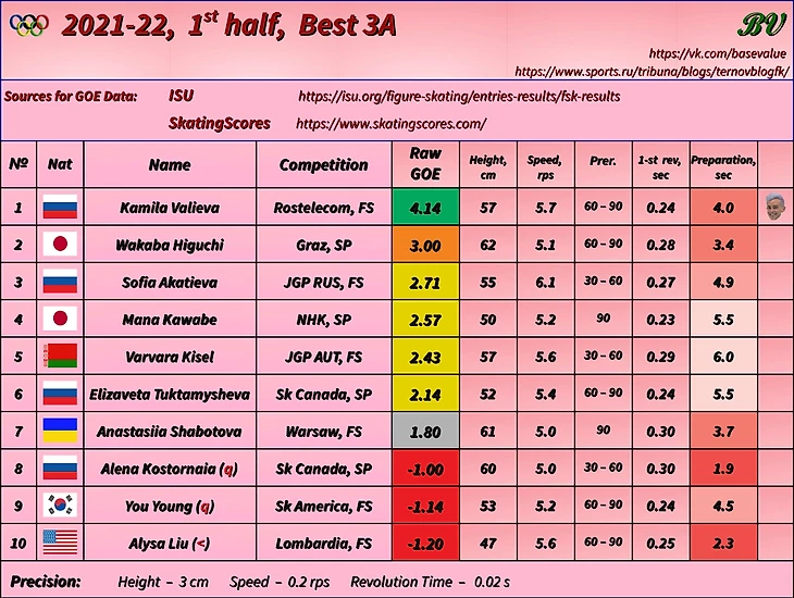 Для полноты картины нужно добавить, что хотя формально у Хигучи здесь и второе место, его в принципе можно оспорить, так как сюда не включены 3А в каскадах. По причине того, что успешных попыток их исполнения у женщин почти не было, а те, что были, отгоены хуже сольных. Но за одним исключением: у Софьи Акатьевой каскад 3А+3Т в короткой ЮГП в России получил 3.14 / 5.00 - немного больше, чем сольный аксель Хигучи