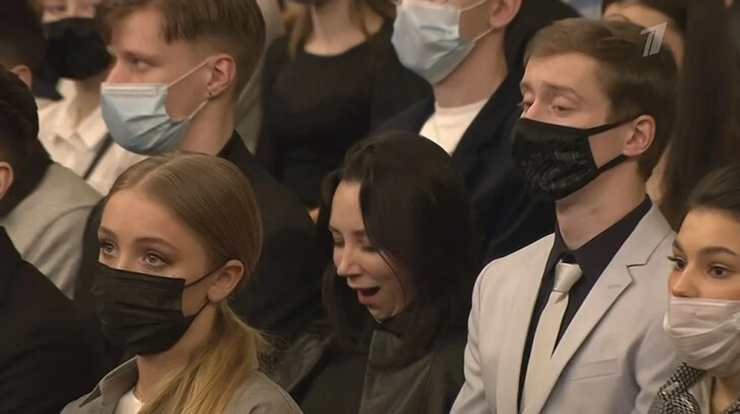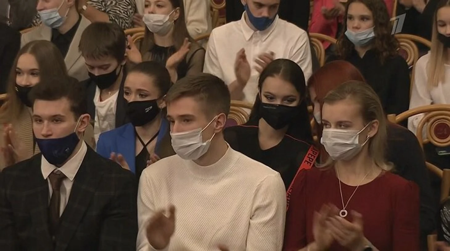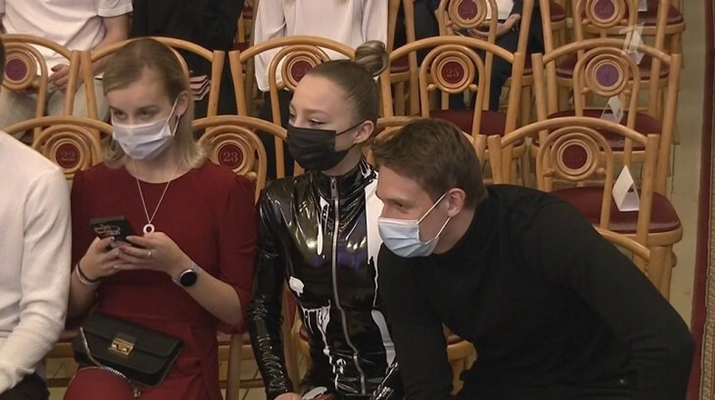 Главные претендентки на медали в женском турнире сидели рядом, второй ряд слева: Майя Хромых, Камила Валиева, Анна Щербакова, Александра Трусова с красными волосами.