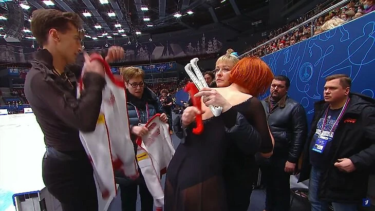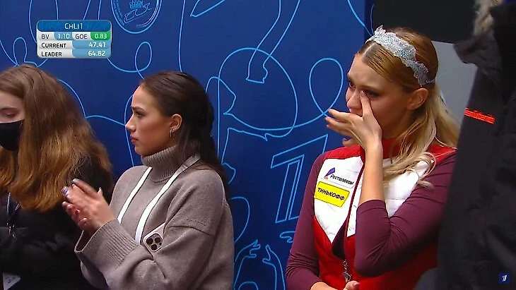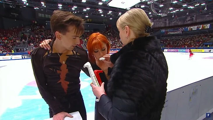 Алина Загитова (она в Санкт-Петербурге с Первым каналом) переживала за друзей за бортиком, Анастасия Скопцова не сдержала слез.