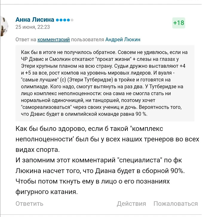 Спортсмены в общем-то оба достойные, со своими плюсами и минусами, и совершенно не очевидно, кто из них на льду окажется сильнее. Зачем это было нужно? На ум приходит только одно объяснение - ФФКР, зная, что в сторону Этери все громче звучит справедливая критика за протаскивание «дочек», делает ход конем и переводит все стрелки на седую голову уважаемого Алексея Николаевича Мишина, и таким образом пытается сместить фокус внимания с блата в танцах и женском и спустить всех собак на мужское, как самое уязвимое место в команде. Если это действительно, так, то интересно, испытывает ли Тутберидзе из-за этого муки совести, ведь получается, что ради прикрытия очевидно нечистого судейства должны страдать и получать хейт совершенно не заслуживающие этого люди. Напротив, армия купленных ботов, получив отмашку от наманикюренной ручки, прискакала на sports.ru и принялась громче всех орать про несправедливость, строчить гневные посты и комменты в сторону Мишина и Семененко, заплюсованные с кучи мультиакков и выведенные в топ. Хотя любой здравомыслящий поклонник фигурного катания распознает эту топорную «за пачку доширака» (с) работу тролля.