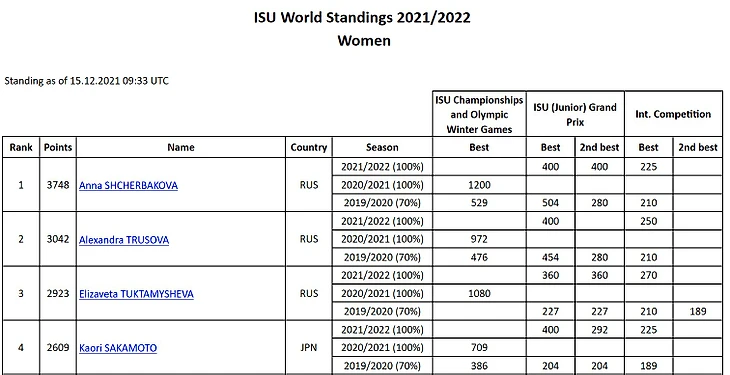 Анна Щербакова выиграла оба этапа Гран-при, в которых участвовала. Туктамышева занимала лишь вторые места. Баллы за прокаты Щербаковой по обеим этапам (236.78 и 229.69) были выше, чем у Туктамышевой (232.88 и 229.23). Победитель этого раунда очевиден - Анна Щербакова.