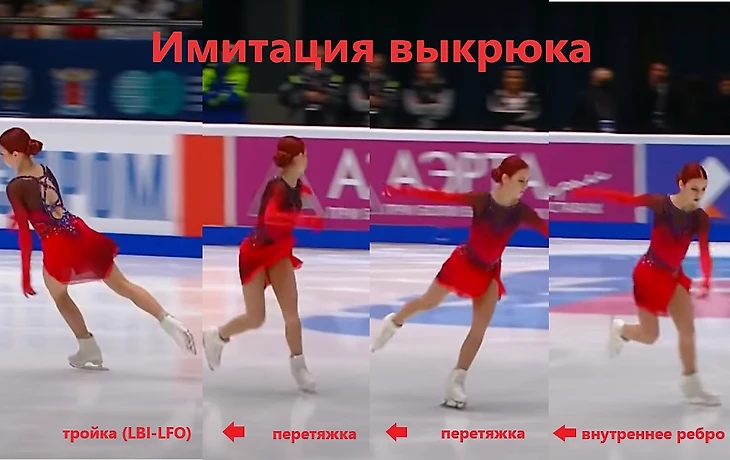 Примерно так же в своё время хитрила Загитова. Подразумевается а-ля оригинальный заход через сложный поворот "выкрюк", но на самом деле исполняется серия простых шагов. Смысл в том, что выкрюк назад-наружу подразумевает сохранение этого наружного ребра, а Трусова (со 2-го на 3-й кадр) меняет ребро (с внешнего на внутренне), и делает более простую связку "перетяжка-тройка"