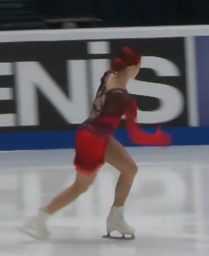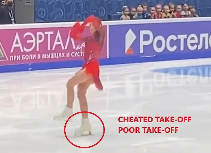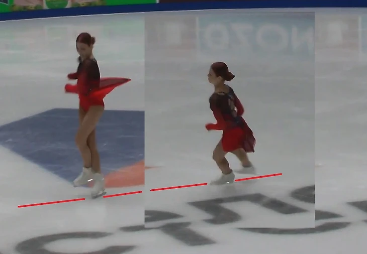 Далее на выезде там опять халтура в скольжении. Фигуристка делает а-ля выкрюк назад-внутрь, но на деле вновь перетяжка-перетяжка-тройка. Т.е. вместо заявленного сложного шага читерством исполняет простую комбинацию шагов. Смысл тот же, что при заходе на флип.
