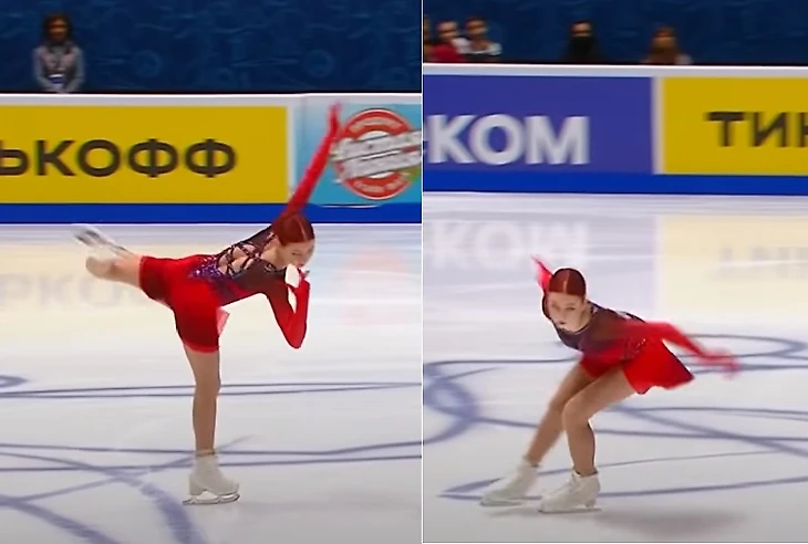 Слева - ни элемент из фламенко, ни спираль, ни арабеск. Это просто зачем-то отведённая в сторону некрасиво согнутая нога. Справа - один из многочисленных моментов, где Глейхенгауз зачем-то заставляет и без того непластичную Трусову кататься согнувшись.