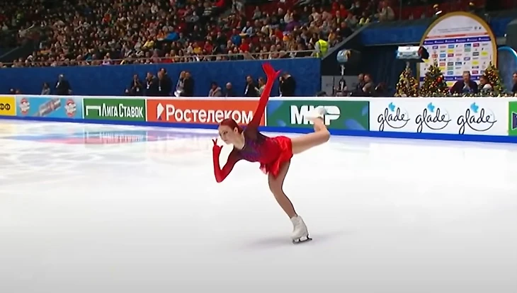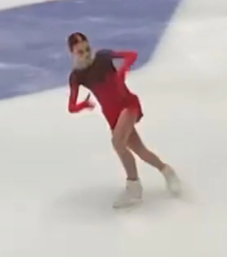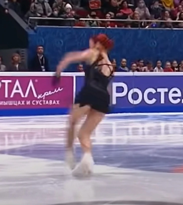 Далее перед трикселем Трусова проедет ещё разок так согнувшись и выйдет в какую-то совершенно нелепую позу: