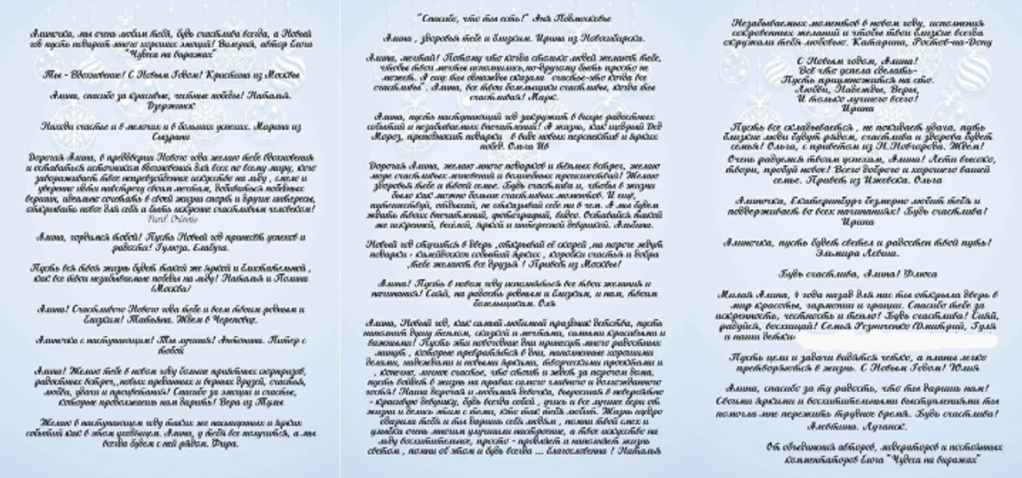 И вы, дорогие друзья, верьте в чудо! Не скупитесь на добрые слова и улыбки! Творите свою историю каждый день, не откладывая мечты в долгий ящик! Пусть в вашем доме царит счастье и тепло, и, как говорит Алина, всем добра и здоровья! С Новым Годом!
