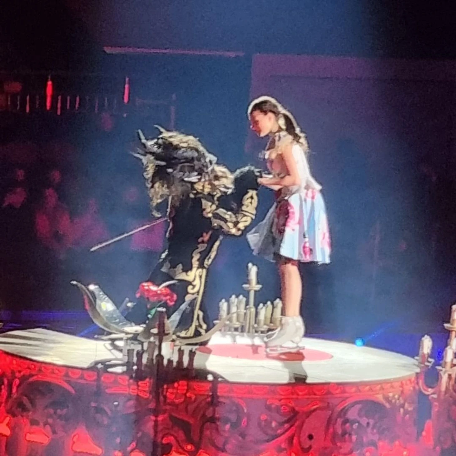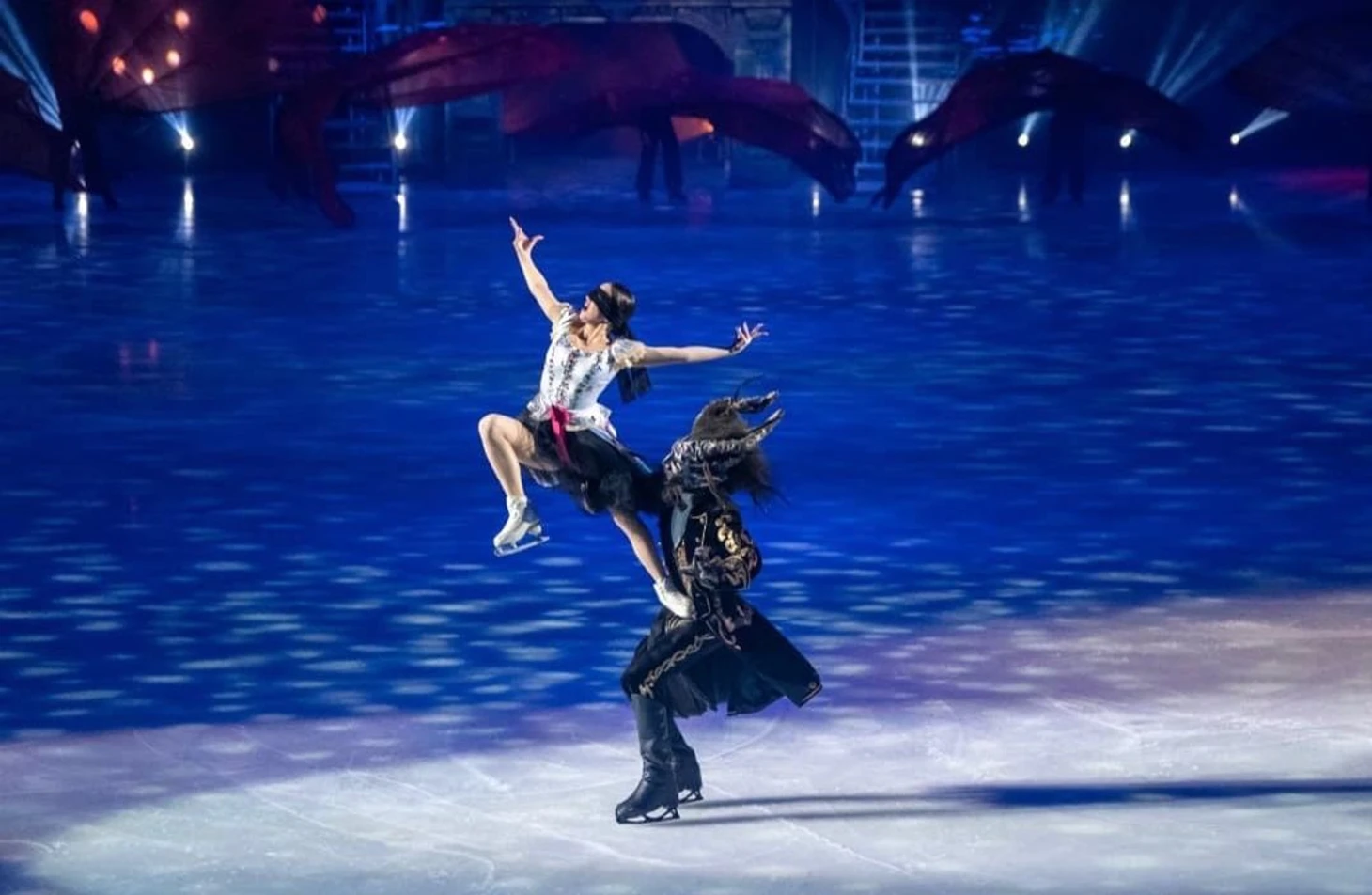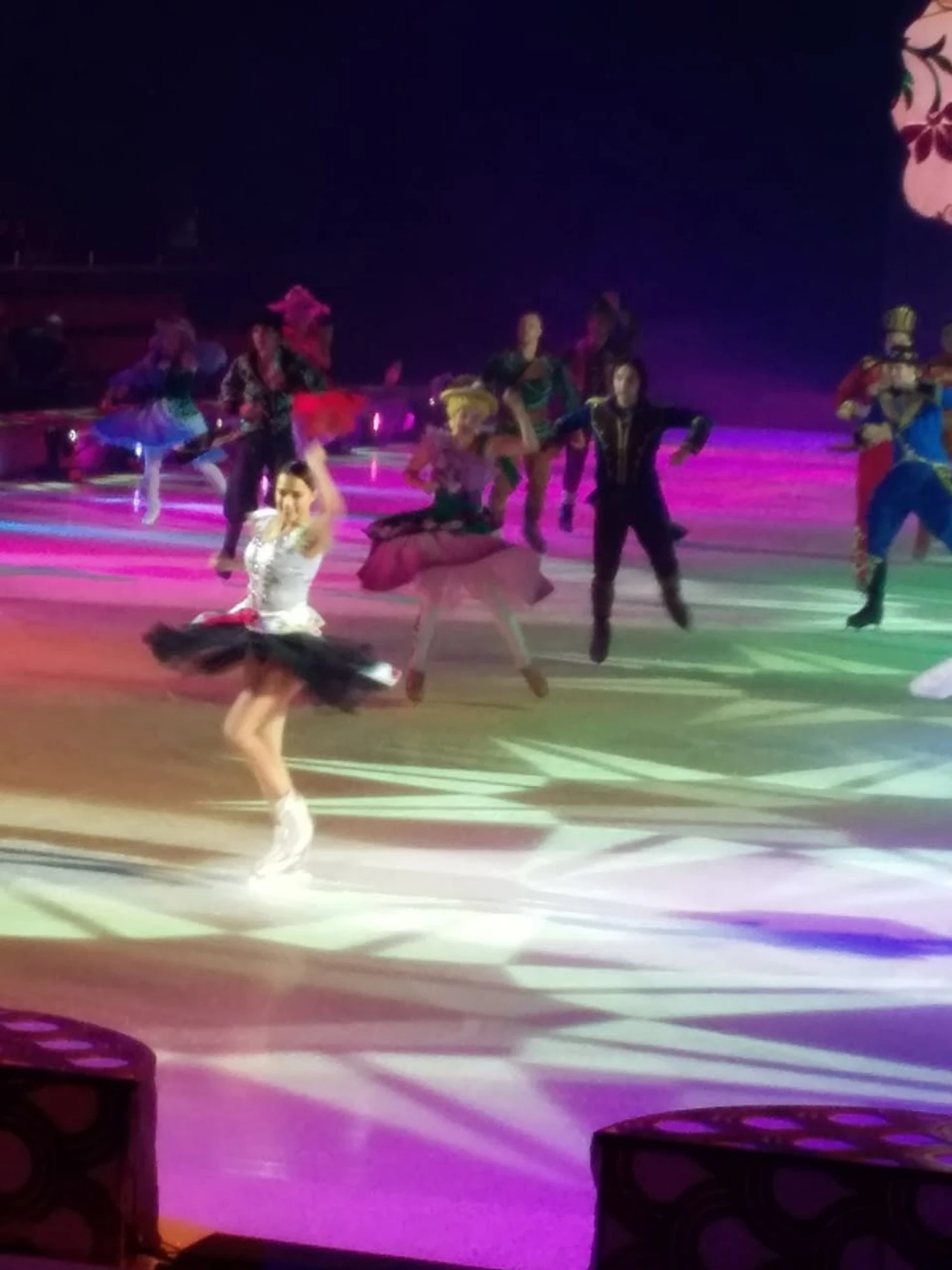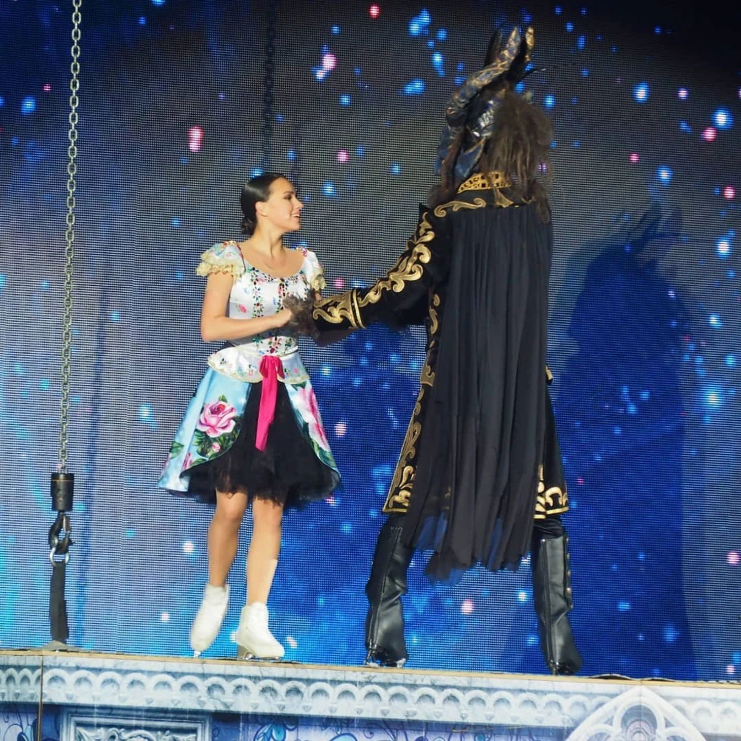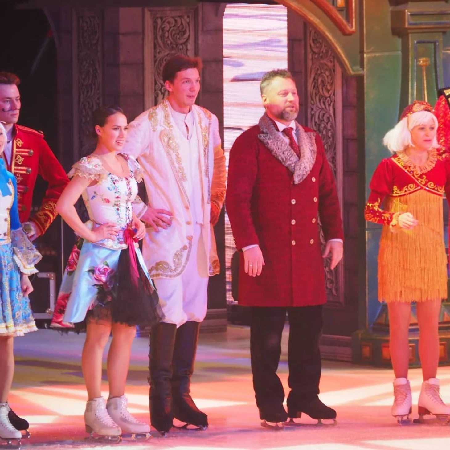 //Шоу-это, конечно, феерия красок, режиссура, декорации, постановки, шикарные песни на неплохие стихи и замечательное исполнение. Шоу выше всяких похвал (тем более это второе посещенное нами шоу после "Спящей красавицы")-костюмы, постановка, смена декораций, все очень живо, пиротехника и звук-за такое шоу никаких денег не жаль. Билеты в свободной продаже-и если у Навки на сайте только партер VIP за 3к, то на СПб билетере на все вкусы-мы были на 8 трибуне 3 ряд. Рядом с нами на лед-выходили-уходили действующие лица, танцевали они тоже перед нами, рисунок танца и смена декораций тоже перед нами во всей красе-поэтому, рекомендую, кто соберется, 8ю-9ю трибуну. Алинка выступает на уровне-зал очень тепло поддерживал, аплодировали не только прыжкам , но и поддержкам. Зрители любят Алину. Люди совершенно разновозрастные-и пожилые пары, и с маленькими детьми, и молодежные компании ,и мамы с дочками. Бросилась в глаза компания –где маленькую девочку сопровождали папа и дедушка) Жаль, что такое шоу пока доступно лишь мск и СПб, думаю, в ином случае хейтеров в сети поубавилось-после шоу приятное послевкусие новогоднего праздника и желание творить добро. Алина с Димой очень мило взаимодействуют, вообще Соловьев открылся для меня с новой стороны. По моему наблюдению, его в паре забивала Боброва (мы были у них на автографсессии на катке в Парке Горького), а тут ему очень комфортно-он поздравляет и благодарит от имени труппы Навки. Полагаю, Димон вытащил удачный билет, раз попал в ее шоу, поэтому спешил вернуться после ЧП на лед. Вообще, обстановка очень дружелюбная. На нашем шоу в 12 ч 6 января, когда отец Насти срывает цветок, чудище выходит на лед из подтрибунного помещения. Перед сценой стояла девушка-фотограф (видимо от Юбилейного), так Соловьев подкрался сзади (она стояла на его пути) и решил пошутить-напугав ее, та аж вскрикнула-хлеще Алины по сценарию. Из главных героев очень понравился Артур Гачинский-очень артистичный, такой самовлюбленный задира. Рада была увидеть Виктора Петренко.//