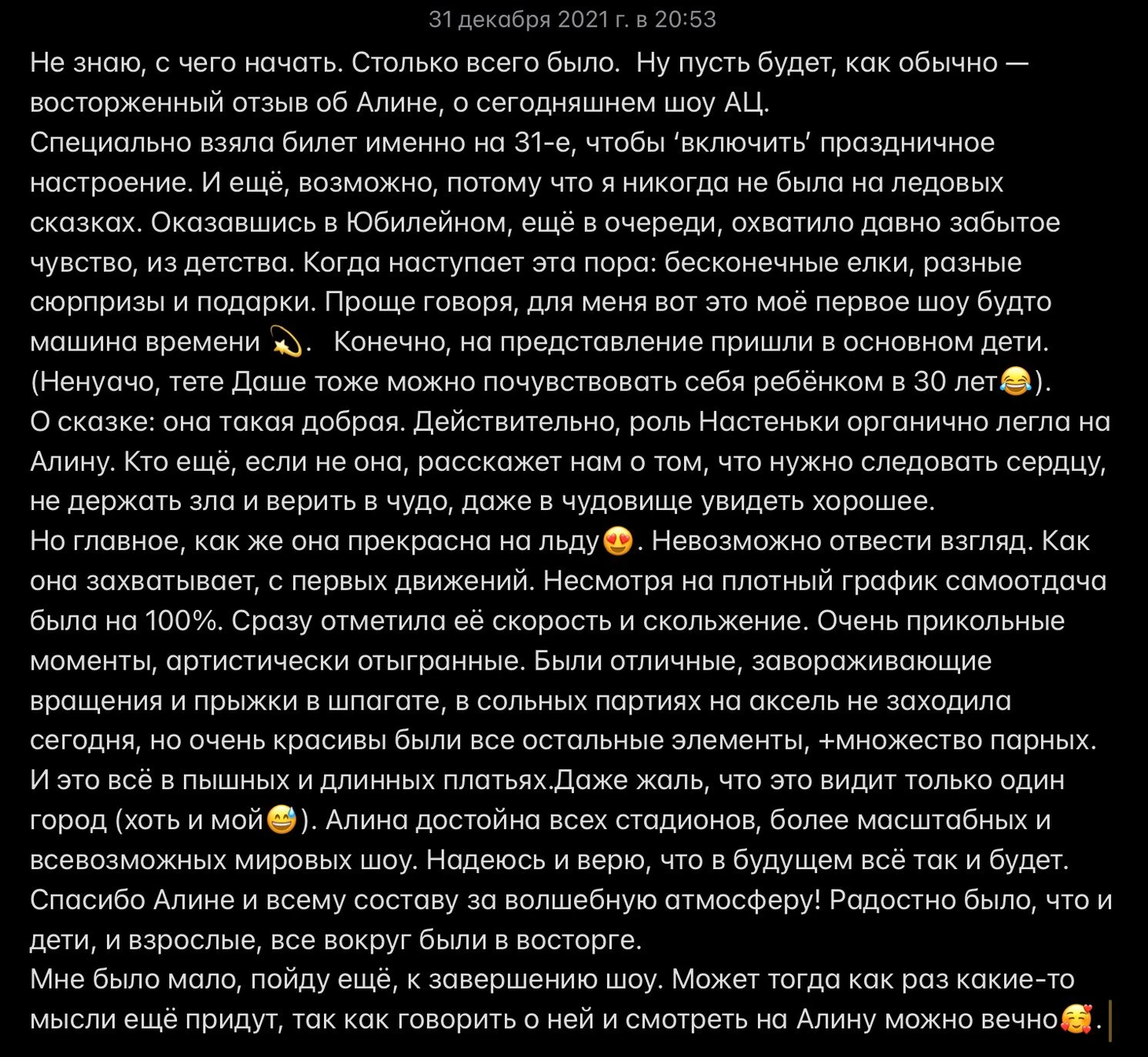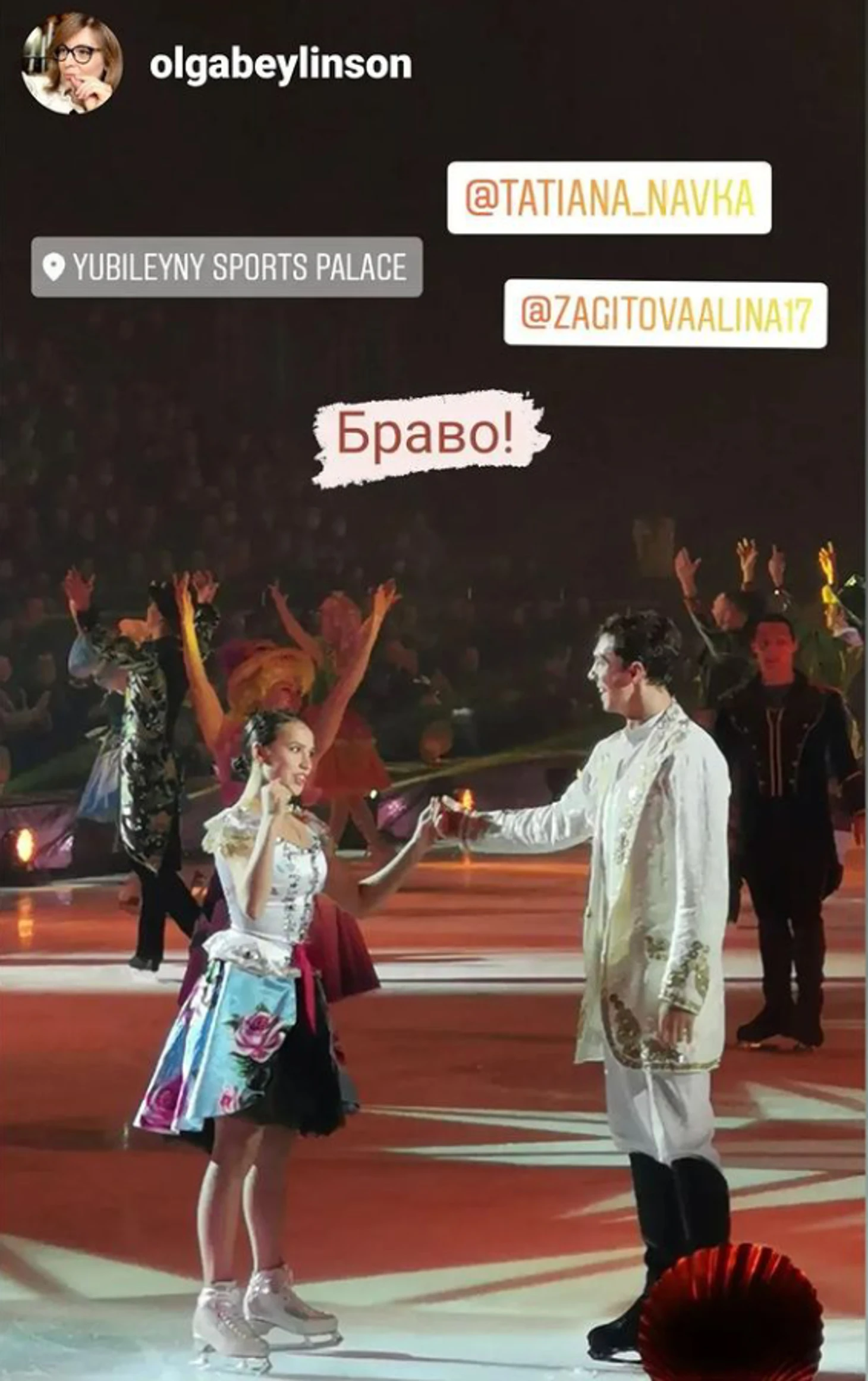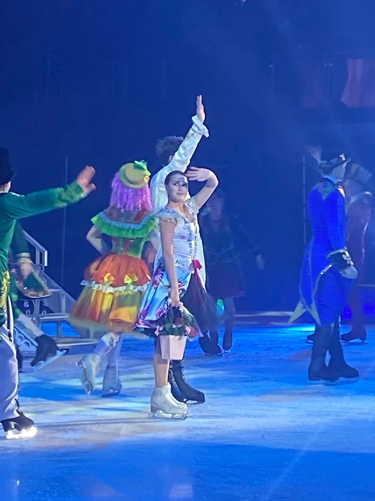 Как говорится "лучше один раз увидеть, чем 💯 раз услышать".В Юбилейном был аншлаг, не смотря ни на какие QR коды. Хотя и была нас целая компания, ещё и с детьми,надо сказать, что детей там было очень много, лично меня привело туда участие Алины. Шоу очень яркое, красочное, музыкальное, понравилось всё. Все отрабатывали по максимуму. Алина, конечно, хороша, и так здорово сыграла Настю! Всё же есть в ней дар перевоплощения и актёрский талант! Не зря же она даже в соревновательных программах так вживалась в образ, что завораживала и влюбляла в себя болельщиков.