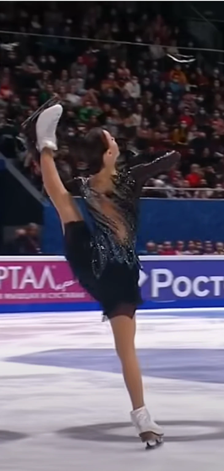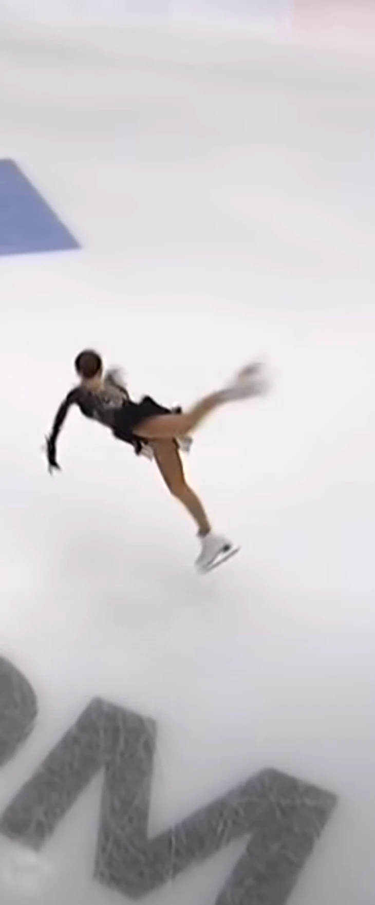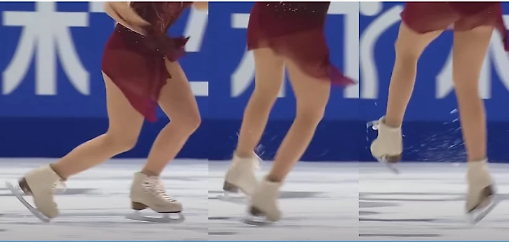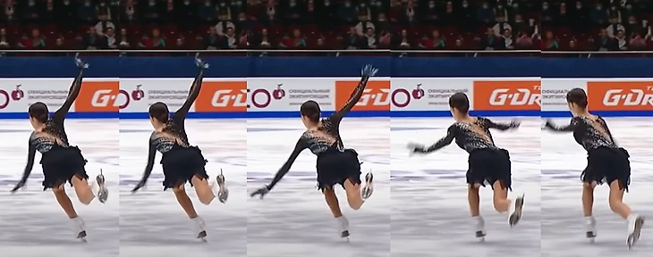 Рассмотрим казалось бы спорный недокрут на сольном трикселе у Туктамышевой. Приземление четвертый кадр. Огромный недокрут на 150 гр, такое было невозможно не заметить.