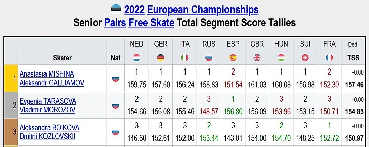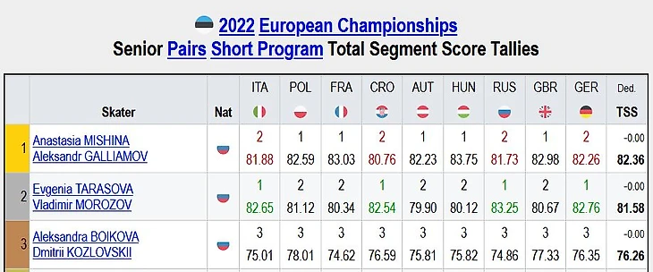 Обратите внимание на таблицу выше. Можно увидеть, что российская судья поставила Тарасовой-Морозову за короткую программу больше всех остальных судей и оценила ее выше, чем победителей короткой программы - Мишину-Галлямова. Это при том, что у Тарасовой-Морозова была явная ошибка на выбросе, а Мишина-Галлямов откатали свою программу чище. Впрочем, следует отметить, что не судьи, а технический специалист понизил Мишиной-Галлямову уровень подкрута до 3-го, и уровень дорожки шагов - тоже до 3-го. И не только российская судья поставила Тарасову-Морозова на первое место, судьи из Италии, Хорватии и Германии были солидарны. Все же следует отметить, что у судьи из Германии разрыв в оценках между Тарасовой-Морозовым и Мишиной-Галлямовым равен нулю, у итальянского судьи - 0,77, а у Кожемякиной - 1,52, и только судья из Хорватии полюбила Тарасову-Морозову больше: отрыв в 1,78 балла.